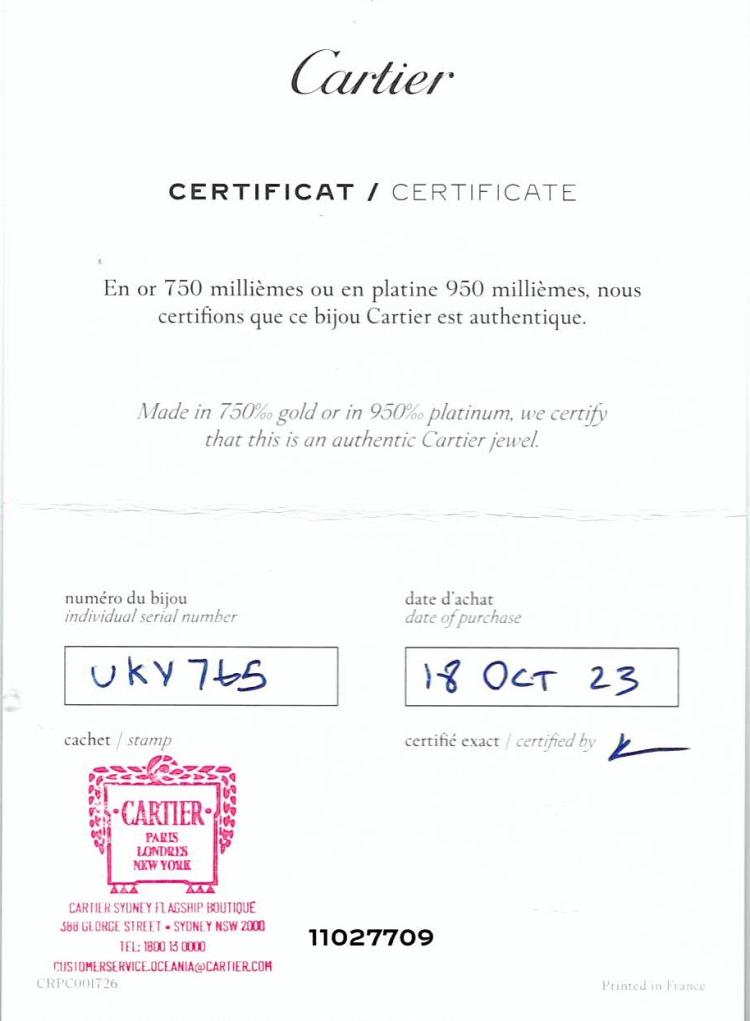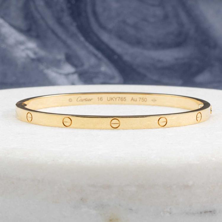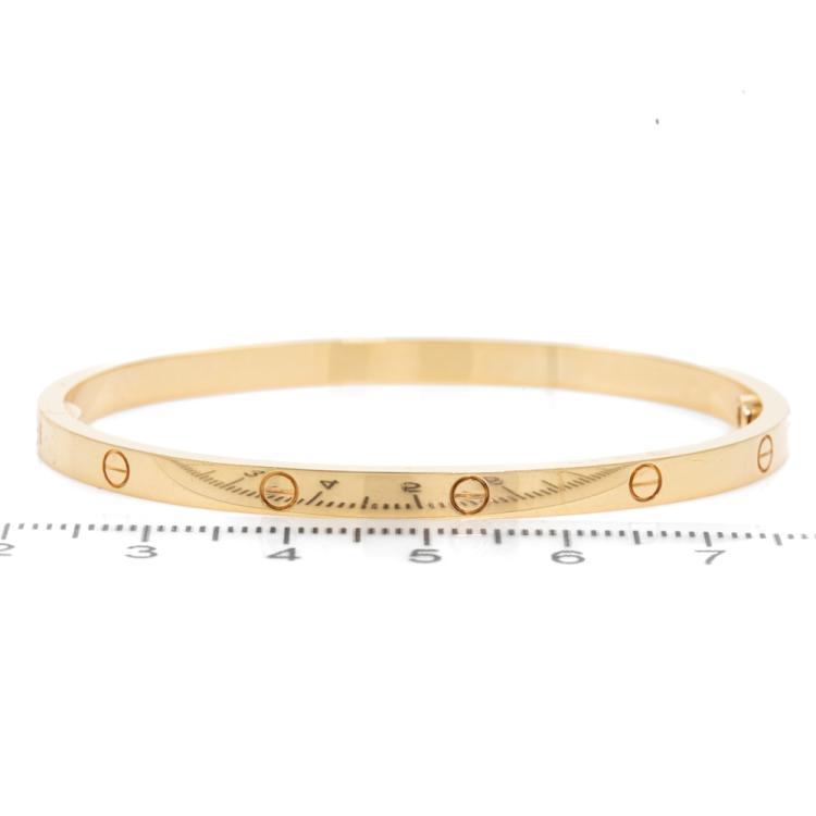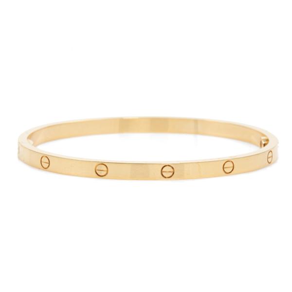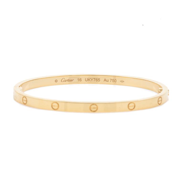 Cartier Love SM bracelet. 18ct yellow gold. Cartier stamped size 16. Width: 3.65mm. Weight: 18.2g. With Cartier screwdriver, box and Cartier Certificate dated 18/10/2023. (Pre-owned)