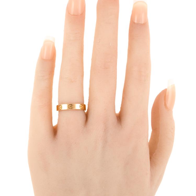 Cartier Love wedding band. 18ct rose gold. Cartier stamped size 50, actual size J1/2 - ring resizing is not recommended. Band width: 3.6mm. With engraving: "7 Aug 04 K to Y" inside band. Weight: 3.8g. (Pre-owned)