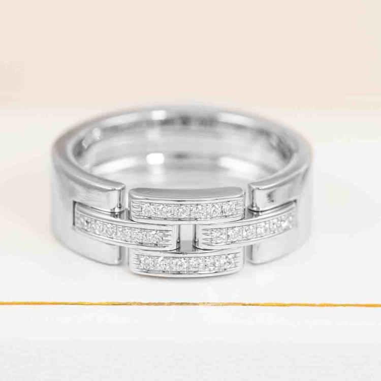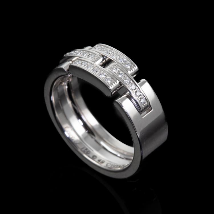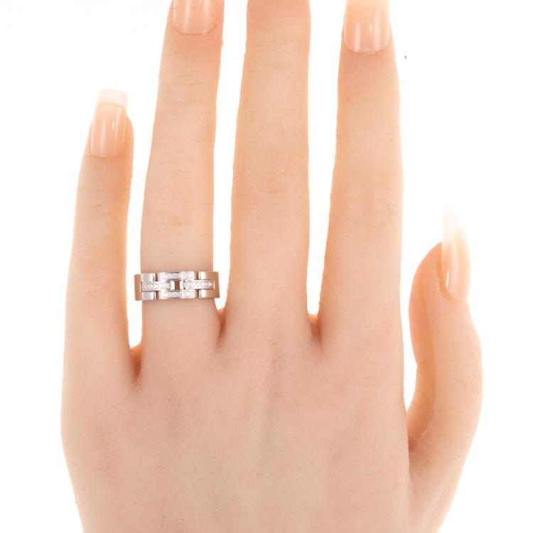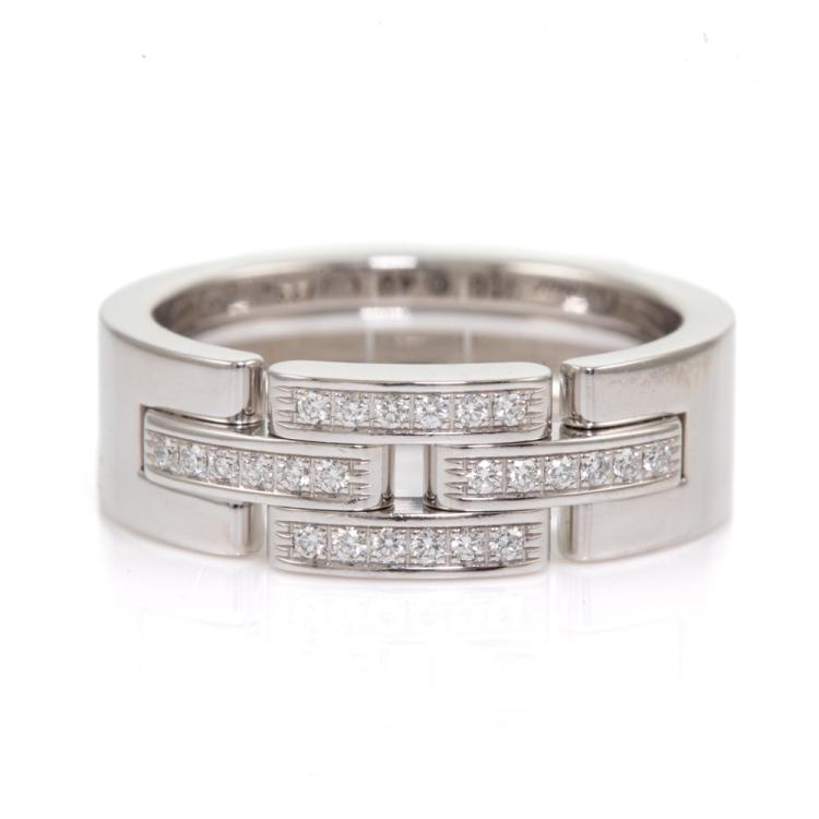 Cartier Maillon Panthere Diamond ring with natural Diamonds totalling approximately 0.12cts. 18ct white gold. Stamped size 49, J1/2 - ring resizing is not recommended. Band width: 6mm. Weight: 7.9g. With Cartier box and Certificate. (Pre-owned)