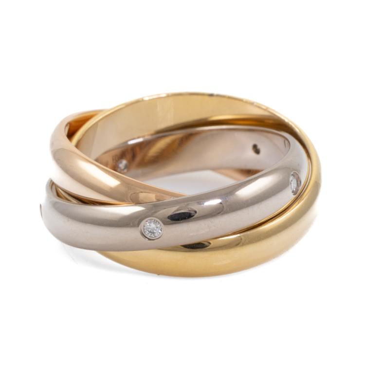 Cartier Trinity ring with 5 round Natural Diamonds totalling 0.06ct. 18ct yellow, rose and white fold. Cartier stamped size 50, actual ring size K - ring resizing is not recommended. Individual band width: 3.5mm. Weight: 9.6g. With Cartier Certificate dated 25/02/20 and Cartier Box (Pre-owned)