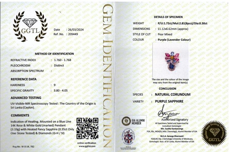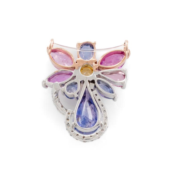 Sapphire and Diamond pendant with mixed cut multi-colour Ceylon natural Sapphires totalling 4.53ct and round natural Diamonds totalling 0.30ct (Estimated grading: G-H SI). 14ct rose & white gold. No chain provided. Weight: 3.1g. With GGTL Report #209449. (As new)