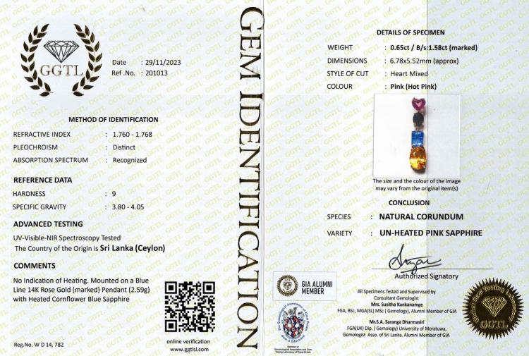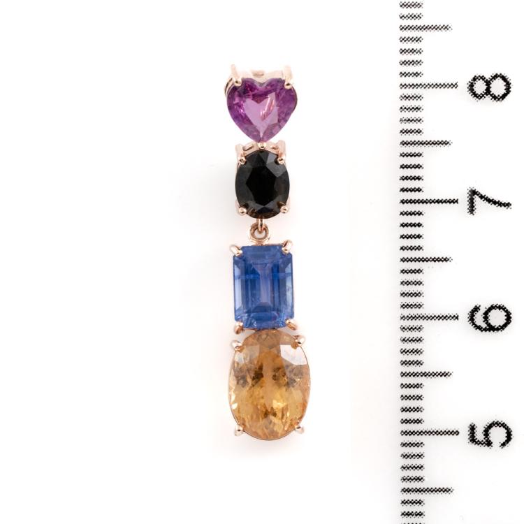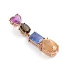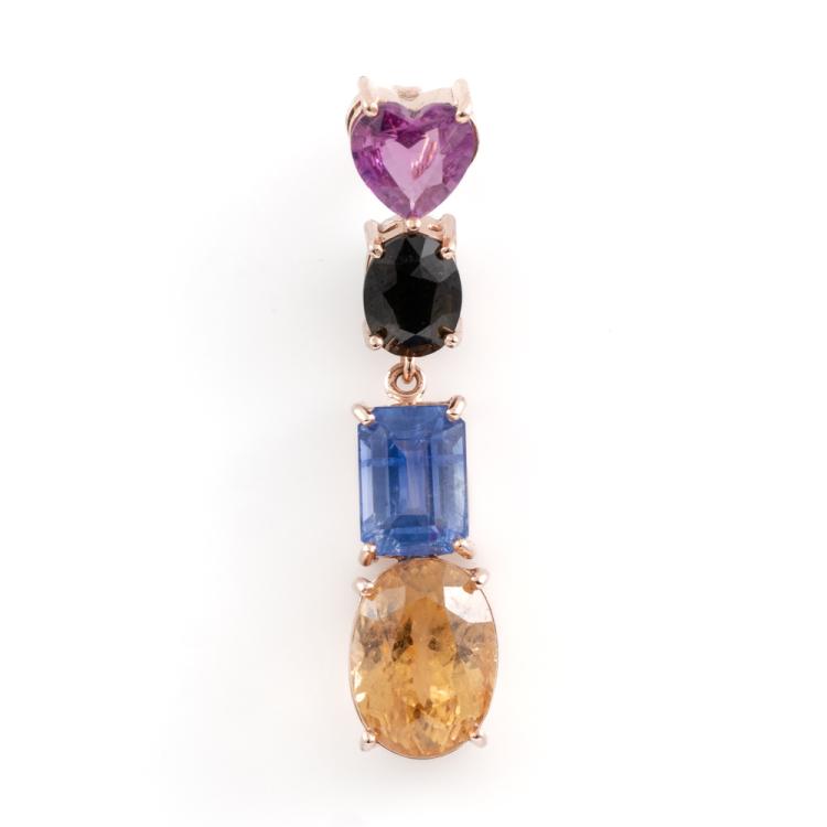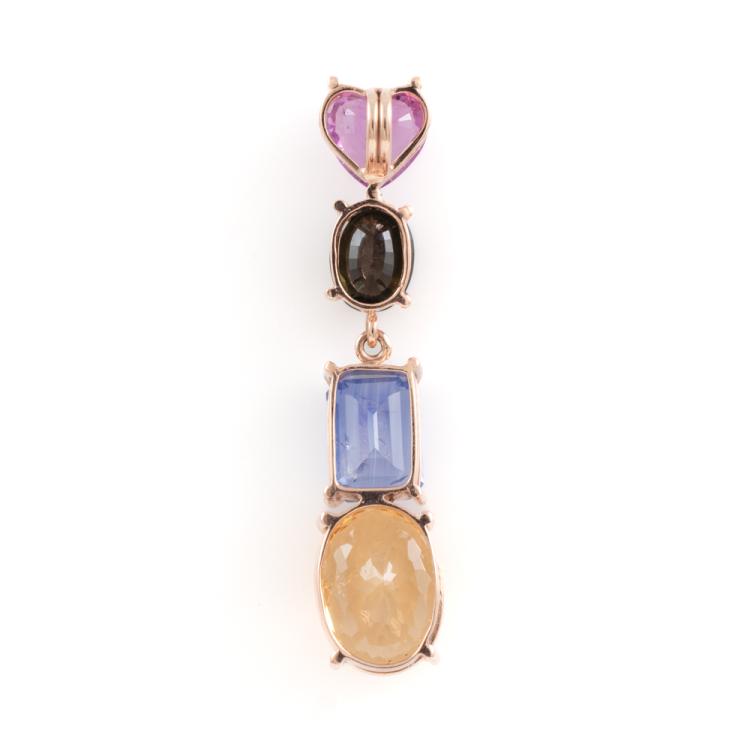 Pendant with multi-colour Natural Gemstone including heart shape Unheated pink Ceylon Natural Sapphire of 0.65ct, emerald cut cornflower blue Sapphire of 1.58ct, oval Natural Citrine of 2.20ct and green Natural Tourmaline of approximately 0.55ct. 14ct rose gold. Length: 3.3mm. Weight: 2.6g. No chain provided. With GGTL Report #201013. (As new)