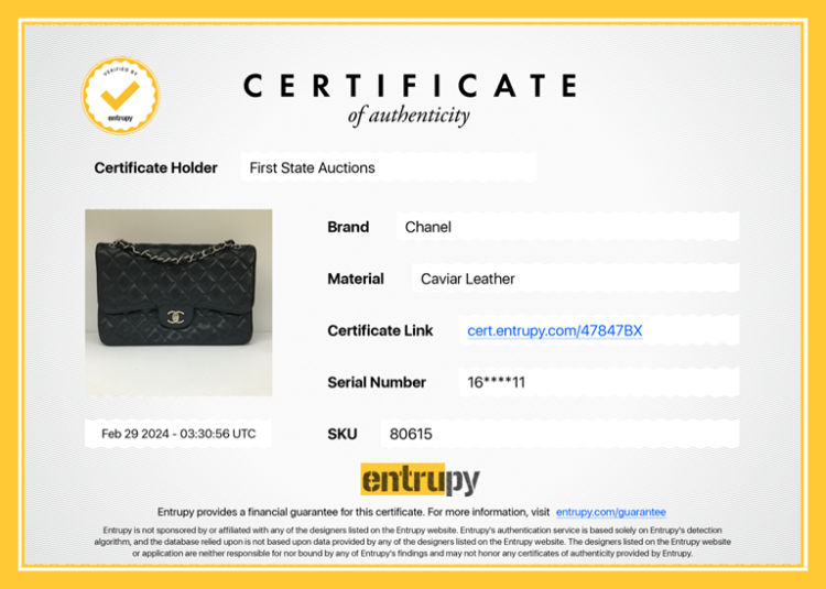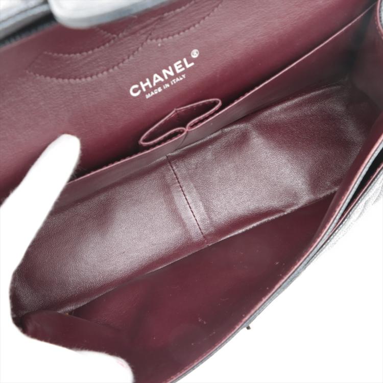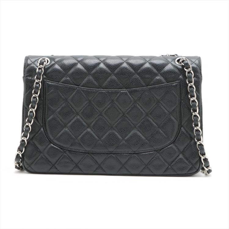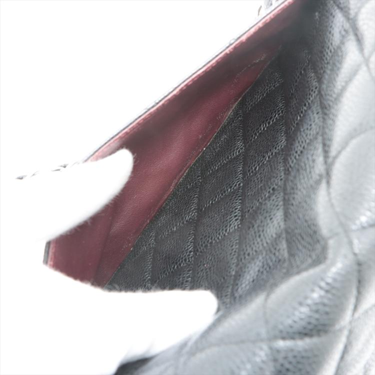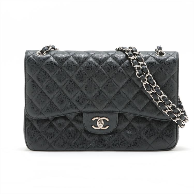 Chanel large double flap bag in black diamond quilted caviarskin with silver-toned hardware. Featuring an exterior rear pocket, a semi-full front flap with a Chanel CC turn lock. This opens to a burgundy leather interior with patch and zipper pockets. Approximate dimensions: 30cm (L) x 19.5cm (H) x 9cm (D), shoulder chain(doubled) height 34cm. Accompanied by Chanel certificate card, info booklet, dust bag and box. With Entrupy Certificate of Authenticity. (Pre-owned)