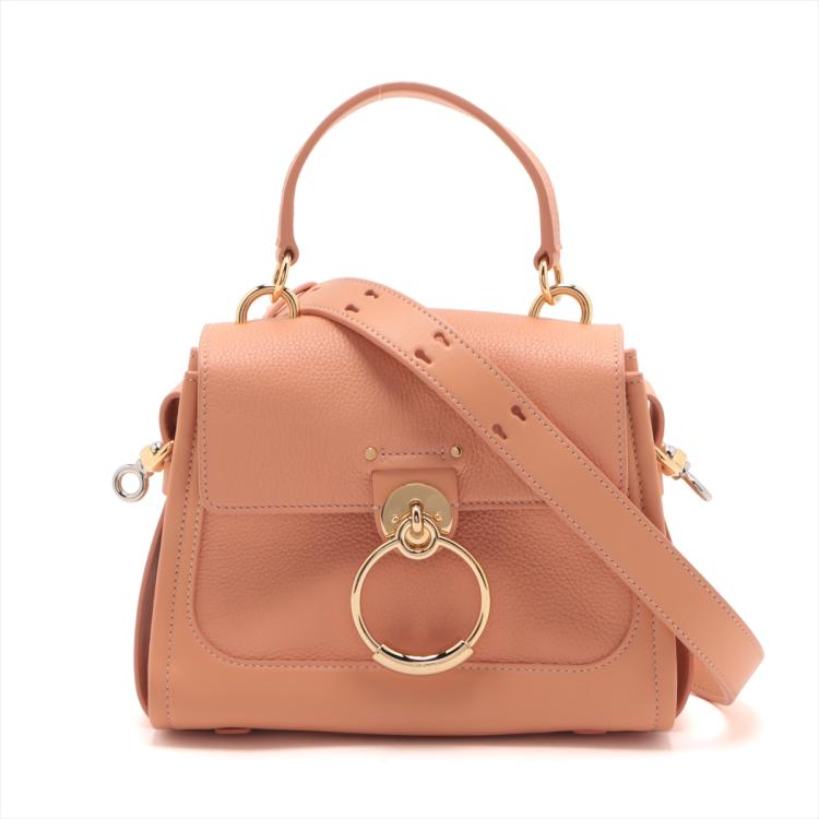 Chloe mini Tess Day bag in peach calfskin leather. Featuring gold & silver toned hardware, single flat top handle, fold over top with push-down button closure and a decorative ring. This opens to a front pocket and fabric lining interior with a zipped pocket. Approximate dimensions: 22cm(L) x 17.5cm(H) x 9.5cm(D), 10.5cm handle drop and 56cm detachable shoulder strap height. Accompanied by Chloe card and dust bag. With Entrupy Certificate of Authenticity. (Pre-owned)
