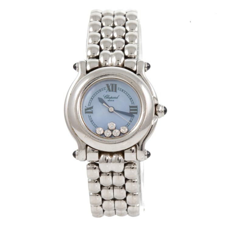 Chopard Happy Sport stainless steel quartz ladies watch. Mother of Pearl dial, 5 floating Diamond, case diameter: 26mm, wrist size: 15.5cm, Swiss made. Ref# 27/8250-23. With Chopard stainless steel bracelet and clasp. With Certificate of Authenticity. 3 month FSA warranty (Pre-owned)