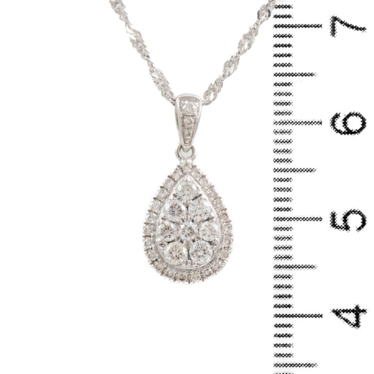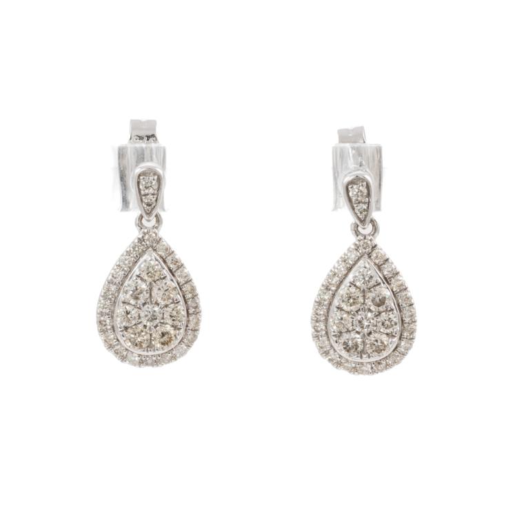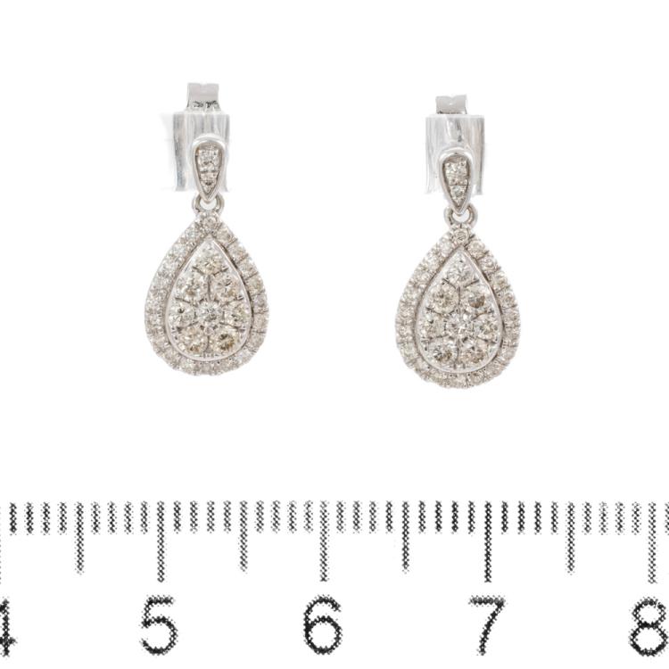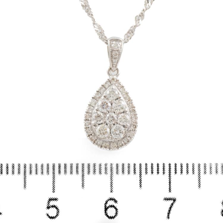 Angus and Coote Diamond pending and Earrings set. Diamond pending with round Diamonds totalling 0.44cts (Estimated grading: H-J VS-P1), 9ct white gold with 41cm 18ct white gold chain, weight: 3.0g. And matching earrings with round Diamonds totalling 0.57cts (Estimated grading: H-J SI-P1), 9ct white gold, weight: 1.6g. Total weight: 4.6g. With copy of GSL Report #AA63604/2. (Pre-owned)^