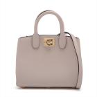 Ferragamo small Studio Box bag in light pink calfskin leather. Featuring dual leather handles, an adjustable and detachable strap, gold-toned hardware, protective studs at bottom. The flip-lock closure opens to a matching leather interior with two flat pockets. Approximate dimensions: 20.5cm(L) x 17cm(H) x 9.5cm(D), handle drop 7.5cm, shoulder drop 57.5cm. Accompanied by a Salvatore Ferragamo dustbag. With Entrupy Certificate of Authenticity. (Pre-owned)