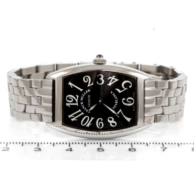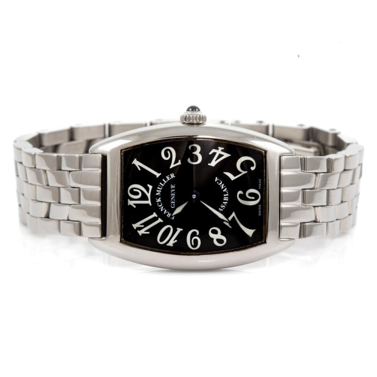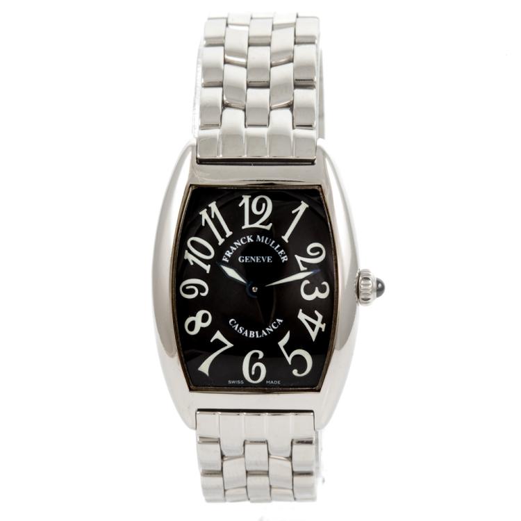 Franck Muller Casablanca stainless steel quartz ladies watch. Black dial, approximate case diameter: 34mm x 25mm, wrist size: 15.5cm, Swiss made. Ref# 1752 QZ C. With Franck Muller stainless steel bracelet and clasp. With Certificate of Authenticity, Undated Franck Muller Certificate of Origin & Warranty and Franck Muller box. 3 month FSA warranty (Pre-owned)