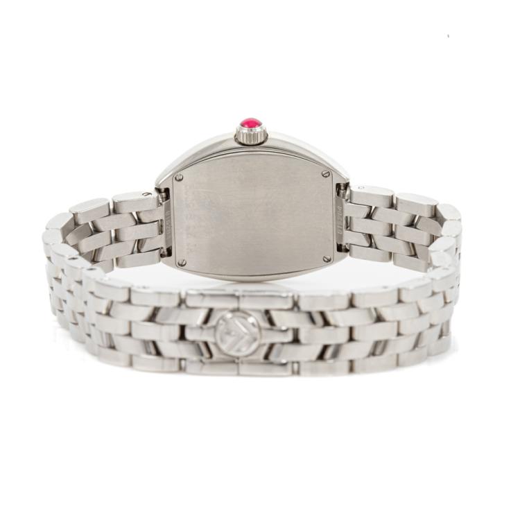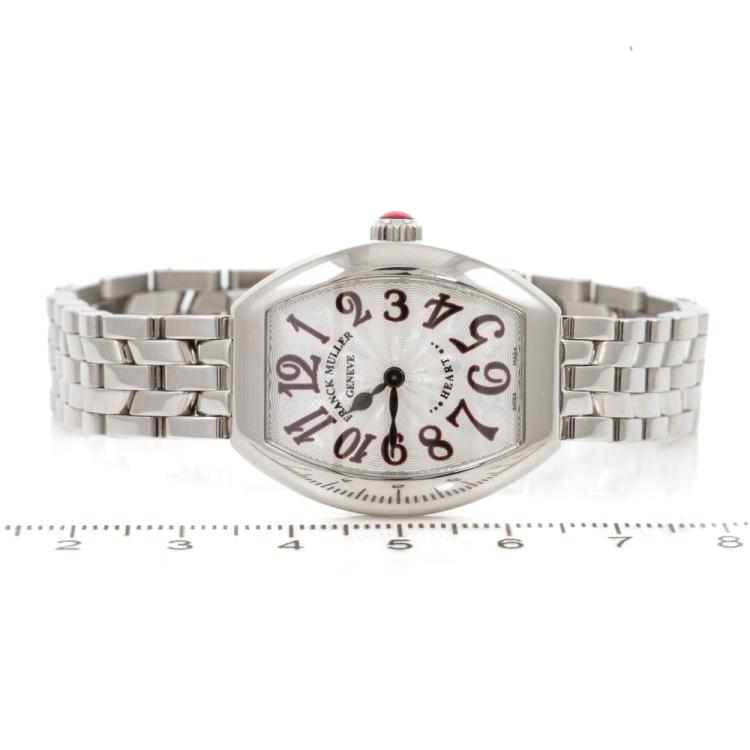 Franck Muller Heart to Heart stainless steel quartz ladies watch. Silver dial, approximate case diameter: 30mm x 25mm, wrist size: 18cm, Swiss made. Ref# 5002SQZJA. With Franck Muller stainless steel bracelet and clasp. With Certificate of Authenticity and Franck Muller box. 3 month FSA warranty (Pre-owned)
