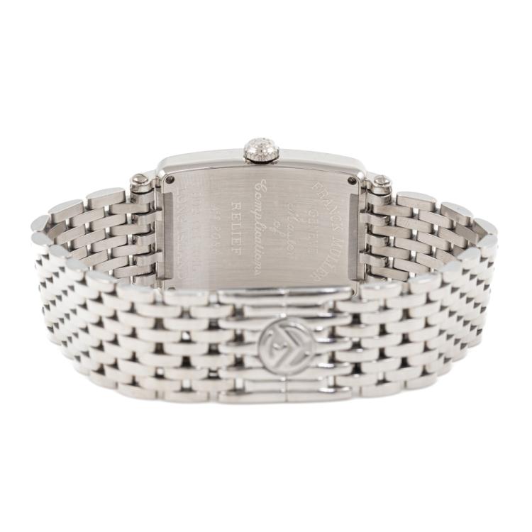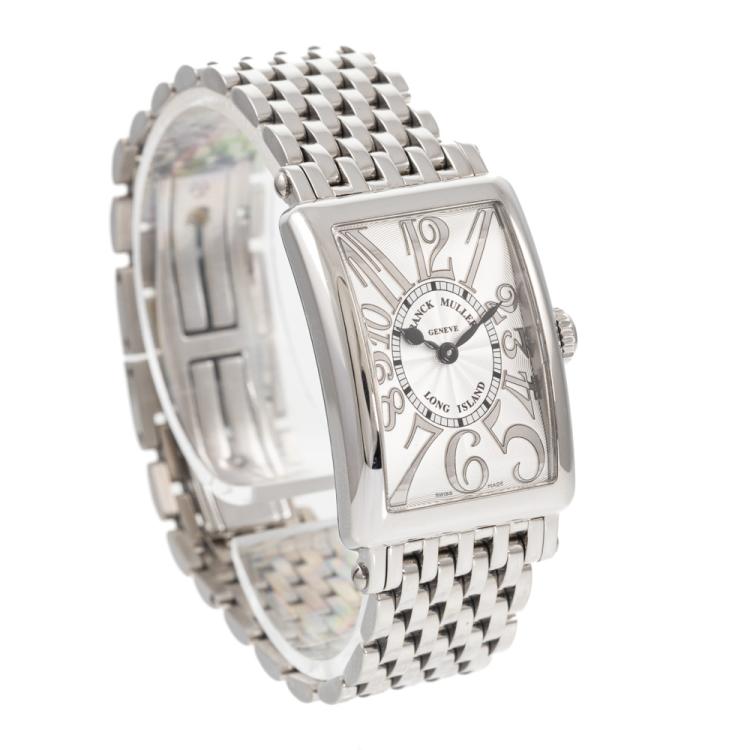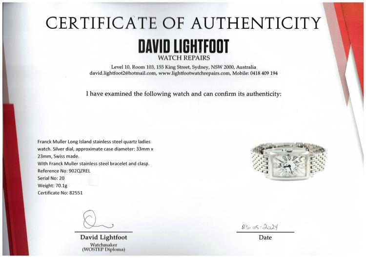 Franck Muller Long Island stainless steel quartz ladies watch. Silver dial, approximate case diameter: 33mm x 23mm, wrist size: 17cm, Swiss made. Ref# 902QZREL. With Franck Muller stainless steel bracelet and clasp. With Certificate of Authenticity, Undated Franck Muller Certificate of Origin & Warranty and Franck Muller box. 3 month FSA warranty. (Pre-owned)