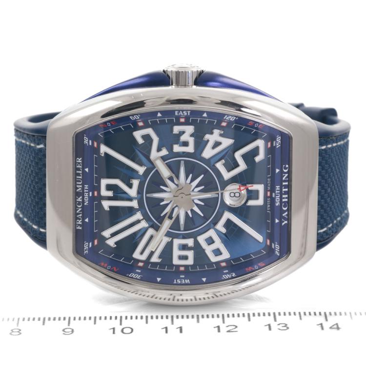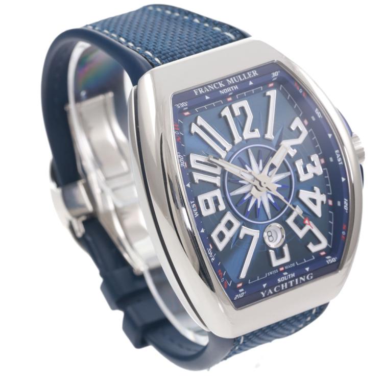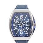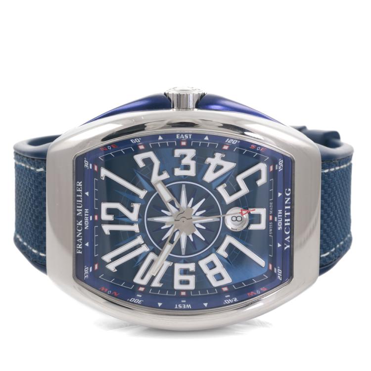 Franck Muller Vanguard Yachting stainless steel automatic mens watch. Blue dial, date, approximately case diameter: 53mm x 44mm, adjustable maximum wrist size: 19.5cm, Swiss made. Ref# V45SCDT. With Franck Muller blue rubber strap and clasp. With Certificate of Authenticity, Franck Muller Certificate of Origin (without any recorded information) and Franck Muller box. 3 month FSA warranty. (Pre-owned)