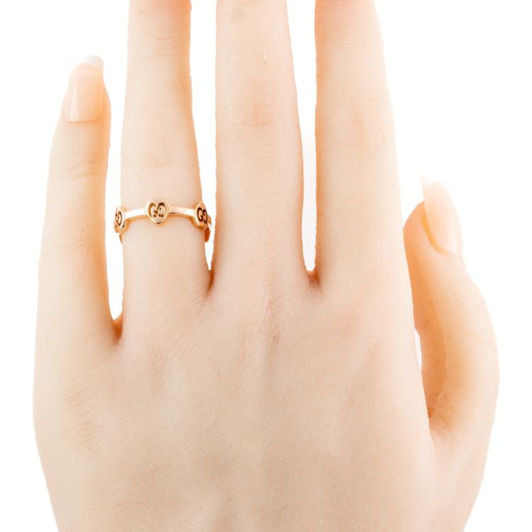 Gucci G Icon Heart station ring. 18ct rose gold. Stamped size 12, L- ring resizing is not recommended. Minimum band width: 2mm. Weight: 3.0g. (Pre-owned)