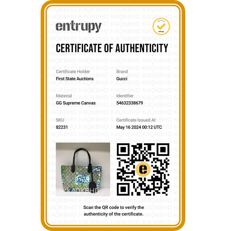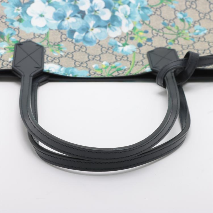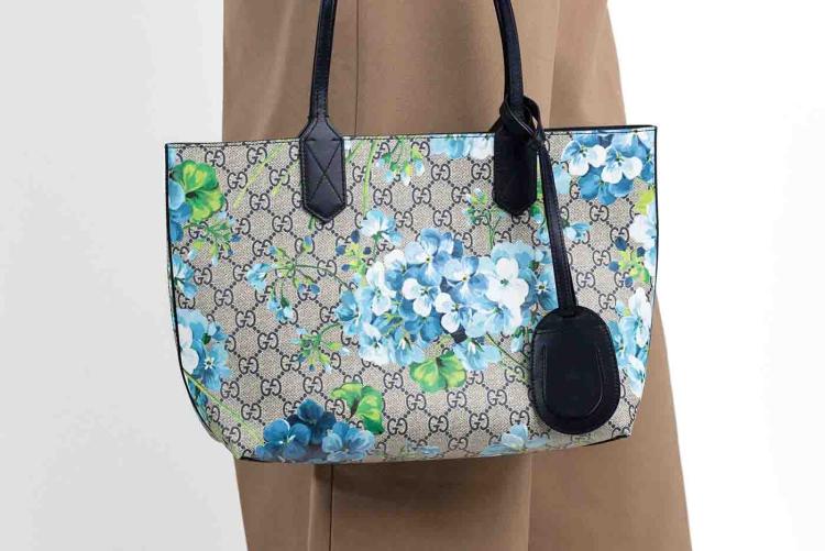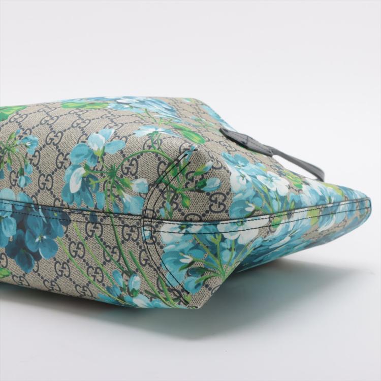 Gucci small reversible tote bag in GG supreme Monogram canvas with blooming flowers printed. Featuring dark blue leather strap top handles, the top opens to a dark blue coated canvas interior that can be reversed to form the exterior. Approximate dimensions: 27.5cm(Base-L) x 22cm(H) x 11cm(D), 18cm strap height. Accompanied by a leather name tag. With Entrupy Certificate of Authenticity. (Pre-owned)