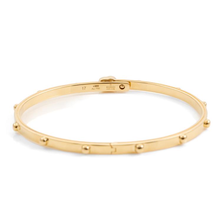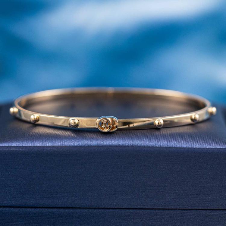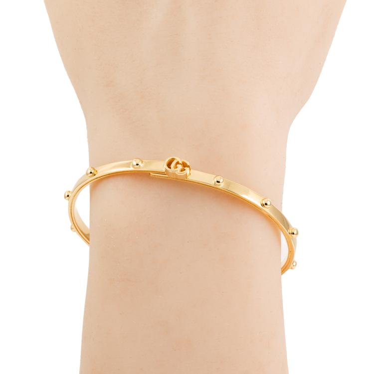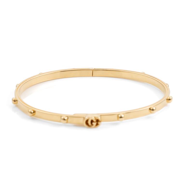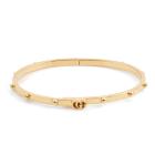 Gucci GG running bracelet. 18ct yellow gold. Double G logo in centre circled by domed studs. Pin in hole style closure at GG logo. Gucci stamped size 17cm. Width: 3.3mm. Made in Italy. Weight: 18.7g. (Pre-owned)