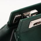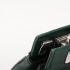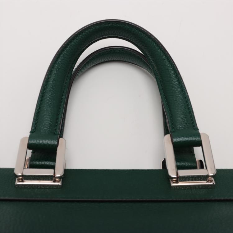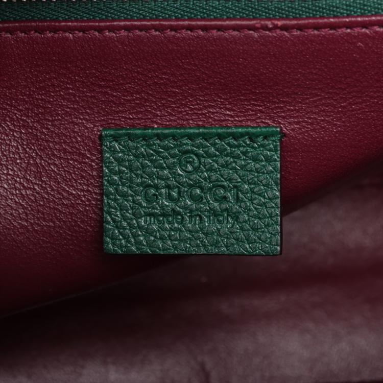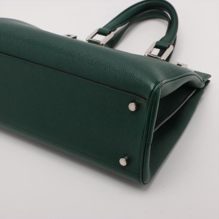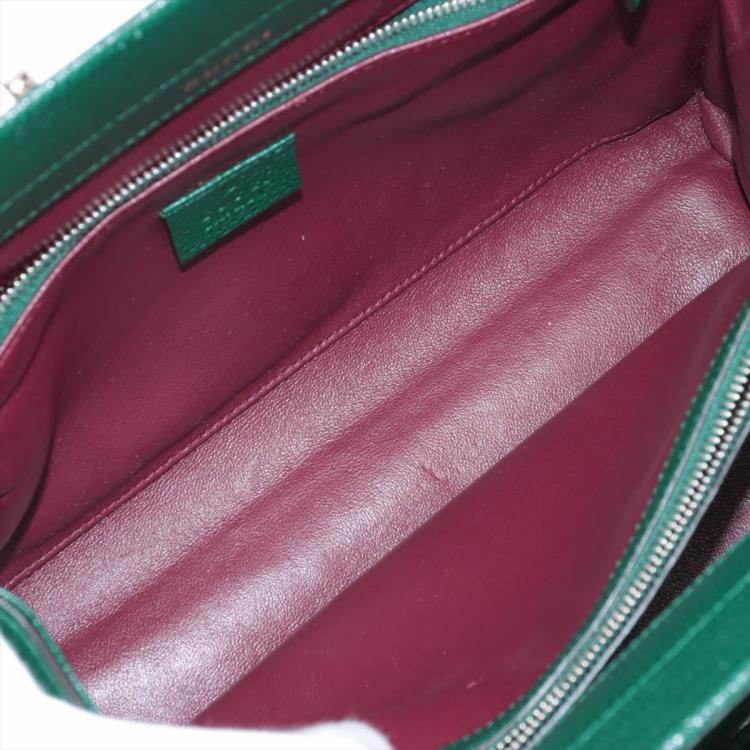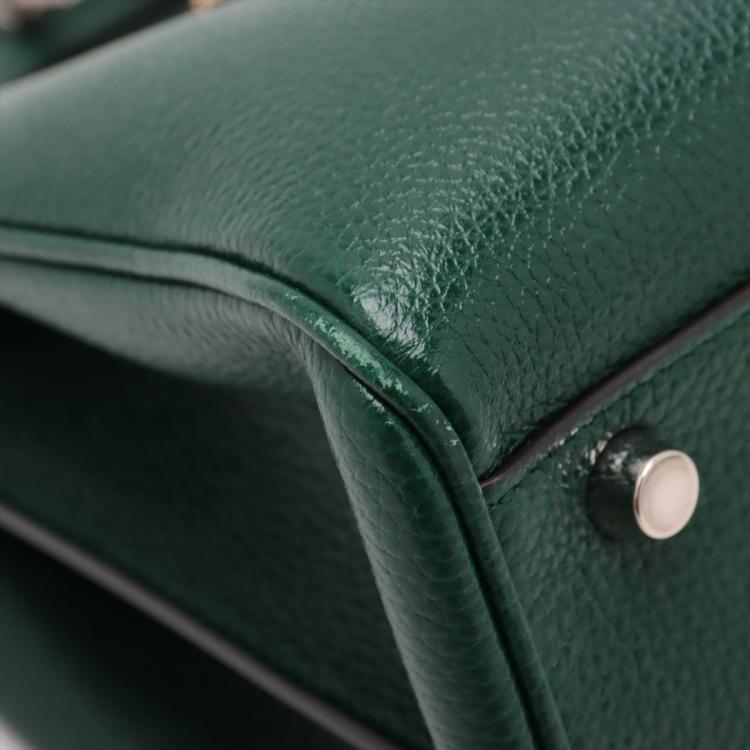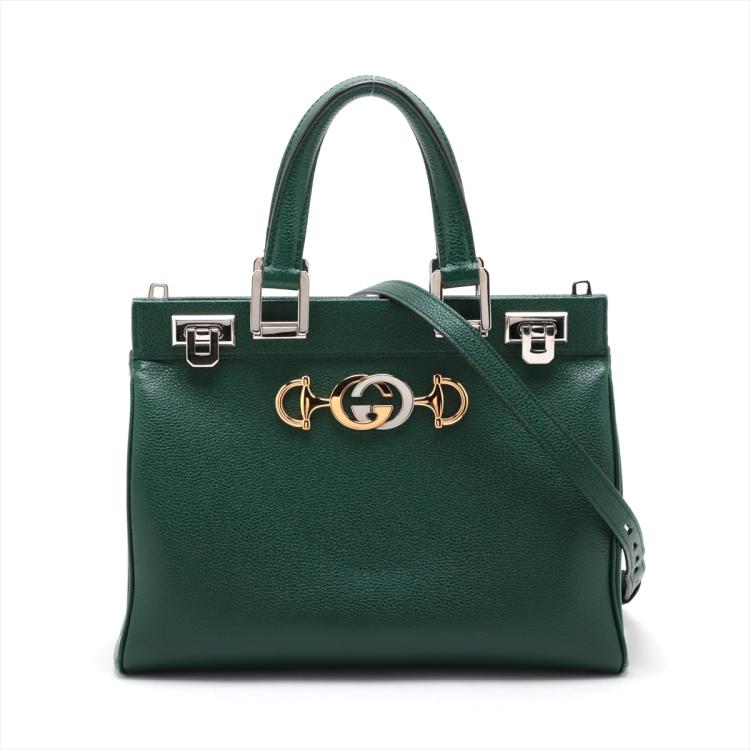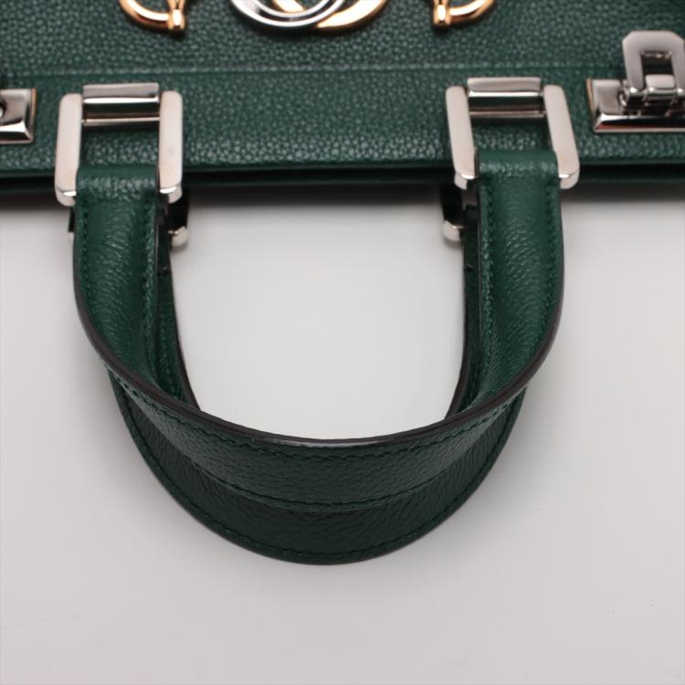 Gucci small Zumi top handle bag in green calfskin. Featuring interlocking G Horsebit logo on front, silver & gold tone hardware, flat handles & single shoulder strap. Turn-lock closures on sides open to a dark red leather lining with 2 compartments divided by a middle zipper pocket. Approximate dimensions: 28cm(L) x 21cm(H) x 12cm(D), 11.5cm handle drop & 49cm adjustable strap drop. Accompanied by a Gucci box. With Entrupy Certificate of Authenticity. (Pre-owned)