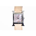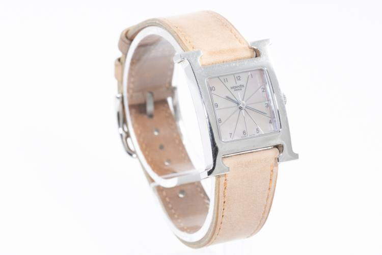 Hermes H stainless steel quartz ladies watch. Mother of Pearl dial, case diameter: 30mm x 21mm, strap length: 16.5cm, Swiss made. Ref# HH1.210. With Hermes light tan leather strap and buckle. With Certificate of Authenticity. 3 month FSA warranty (Pre-owned)