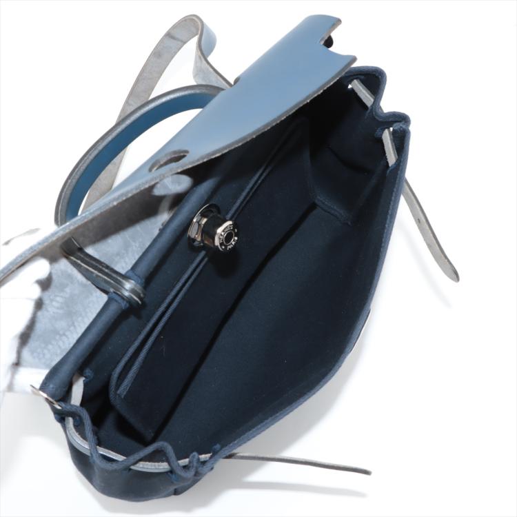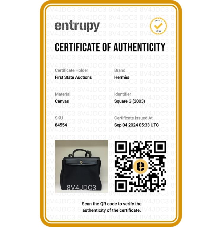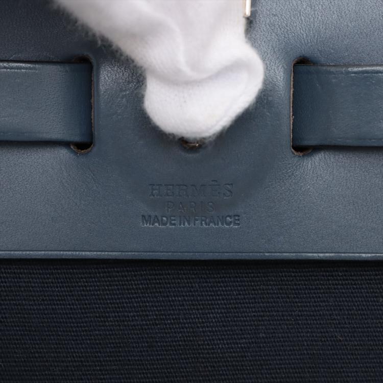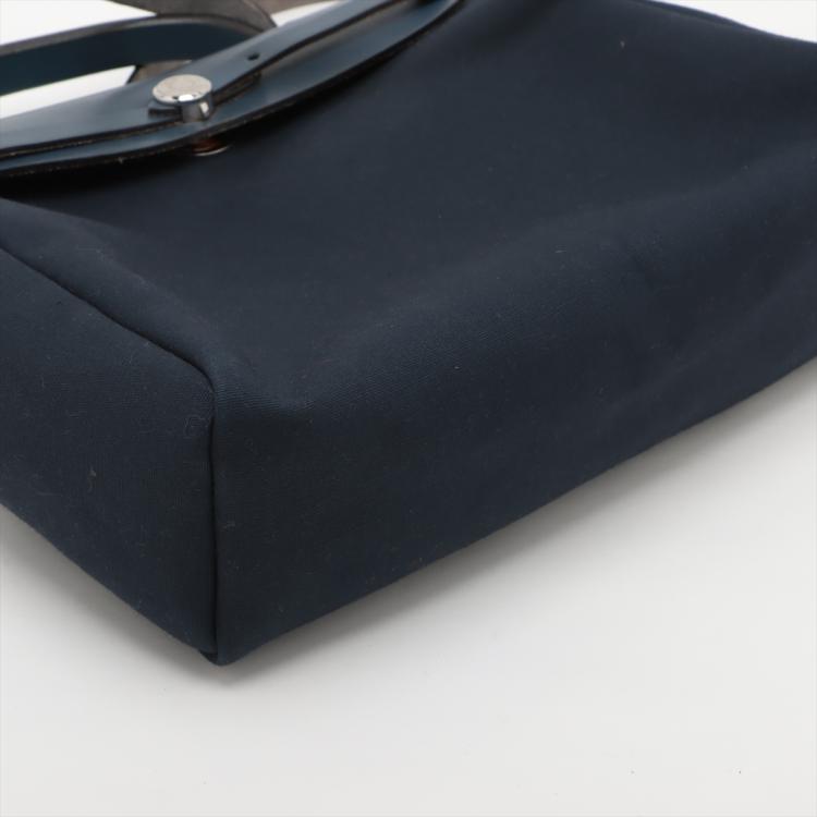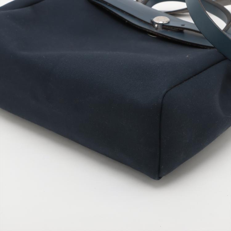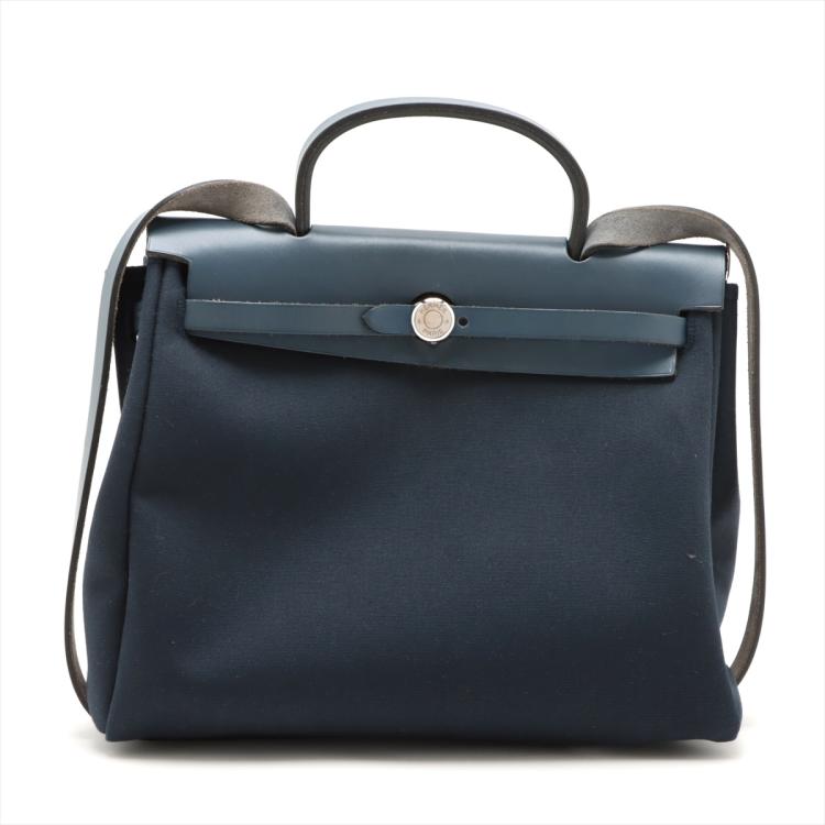 Hermès Herbag PM in navy blue smooth leather and blue and Beige woven canvas (Square G: 2003). Featuring interchangeable canvas body, silver-toned hardware, leather top crest, single handle and shoulder strap. The flap with strap closure opens to a matching canvas interior with a patch pocket. Approximate dimensions: 30.5cm(L) x 26.5cm(H) x 10.5cm(D), strap drop 47cm, handle drop 7.5cm. Accompanied by Hermes dustbags. With Entrupy Certificate of Authenticity. (Pre-owned)