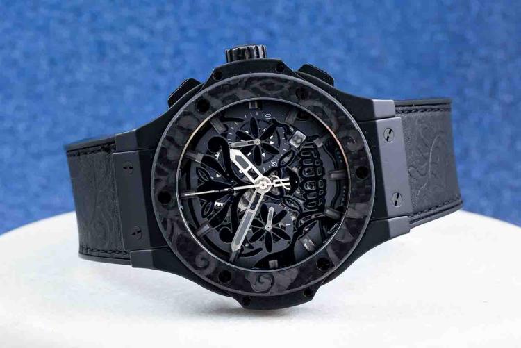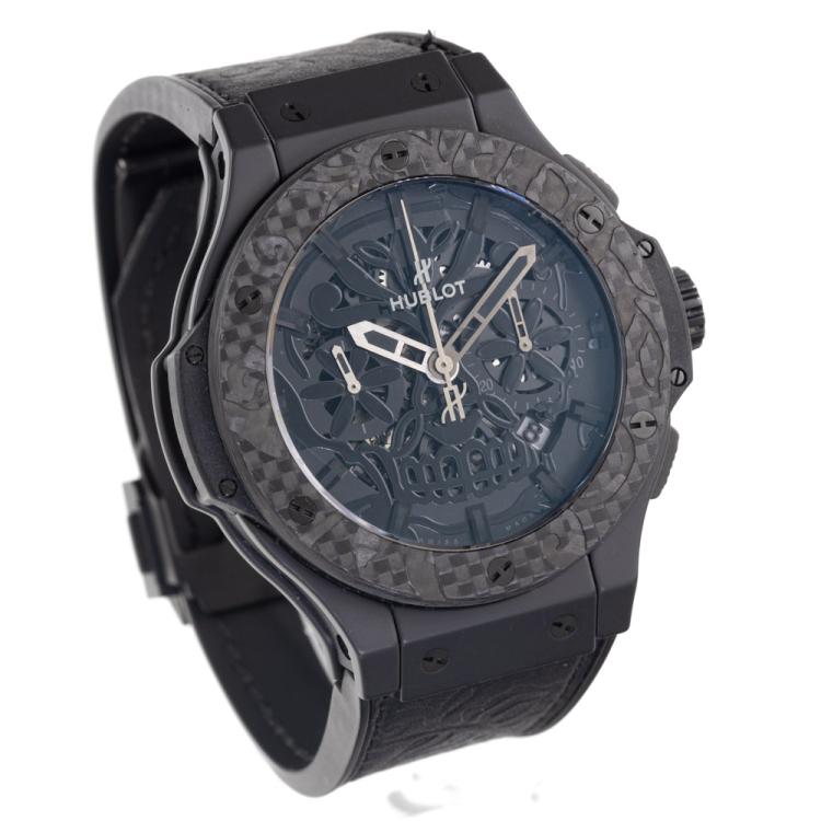 Hublot Big Bang Aero Bang Sugar Skull Limited Edition of 200 ceramic automatic mens watch. Black skeleton dial, date, case diameter: 44mm, adjustable wrist size: 20cm, Swiss made. Ref# 311.CQ.1110.VR.FDK15. With Hublot black rubber x leather strap and clasp. With Certificate of Authenticity, Hublot International Warranty Card. 3 month FSA warranty. (Pre-owned)