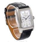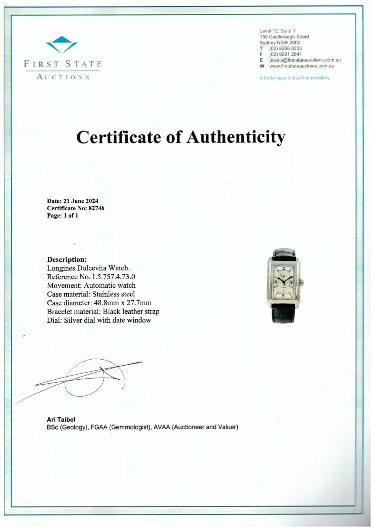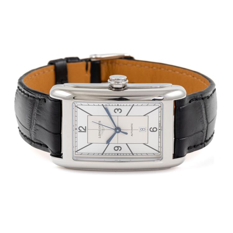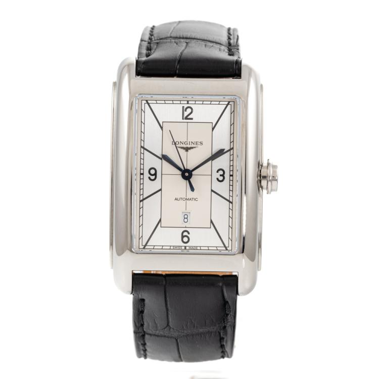 Longines Dolcevita stainless steel automatic watch. Silver dial, date, case diameter: 48.8mm x 27.7mm, strap length: 20cm, Swiss made. Ref# L5.757.4.73.0. With Longines black leather strap and buckle. With FSA Certificate of Authenticity and Longines box. 3 month FSA warranty (As new, Note: scratches on case and minor wear marks on strap due to being display stock)