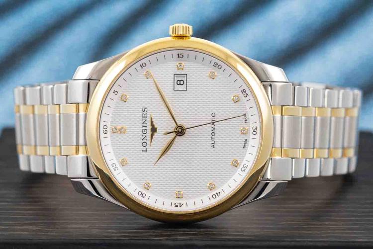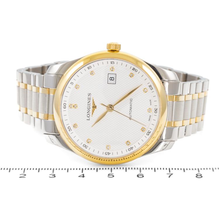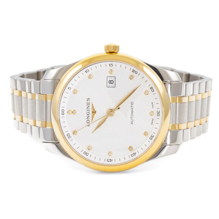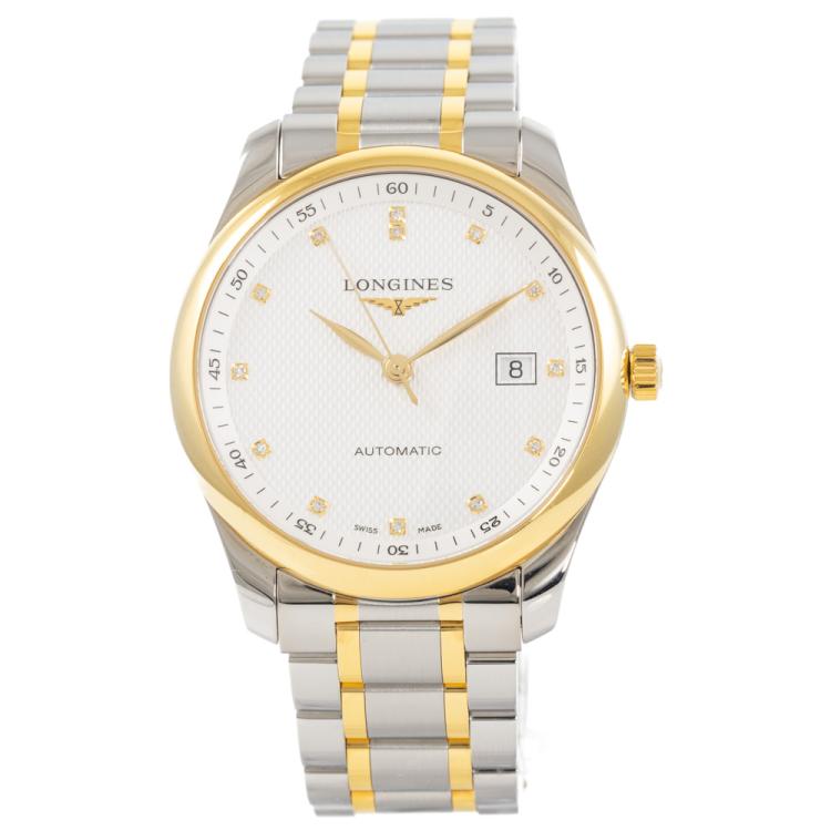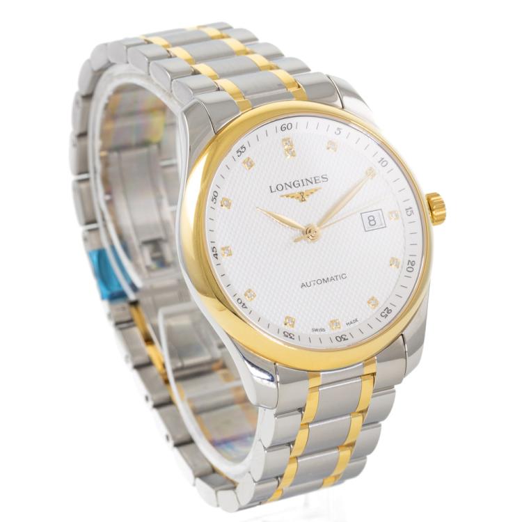 Longines Master Collection 18ct yellow gold and stainless steel automatic mens watch. Silver dial, Diamond indicators, date, case diameter: 40mm, wrist size: 19.5cm, Swiss made. Ref# L2.793.5.97.7. With Longines two-tone bracelet and clasp. With FSA Certificate of Authenticity, Longines Diamond Certificate card and Longines box. 3 month FSA warranty (As new, Note: minor scratches on case and bracelet due to being display stock)