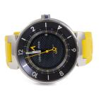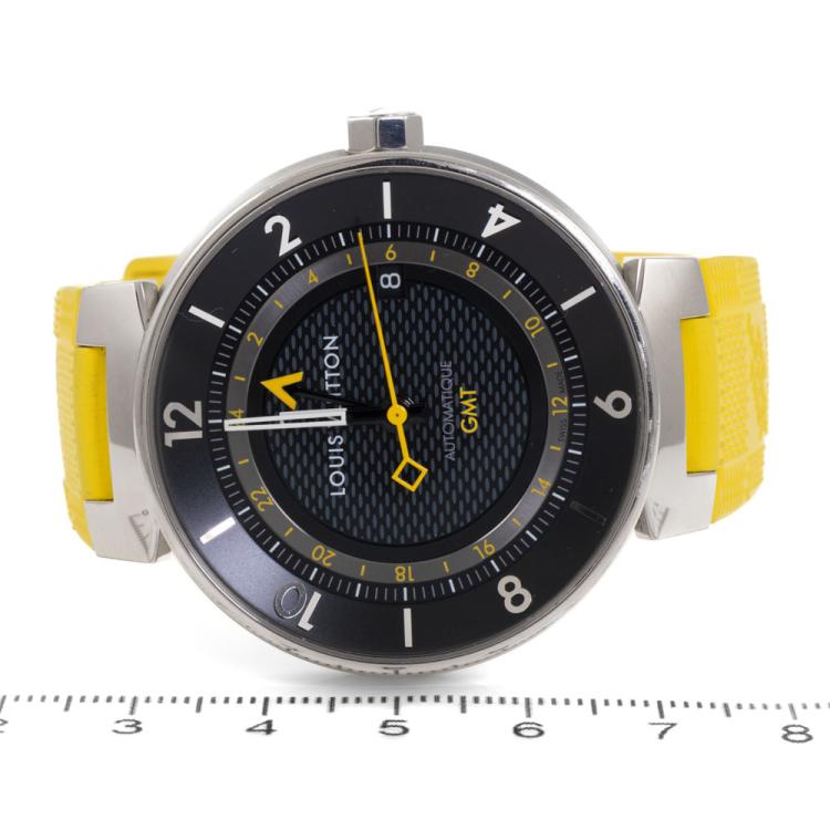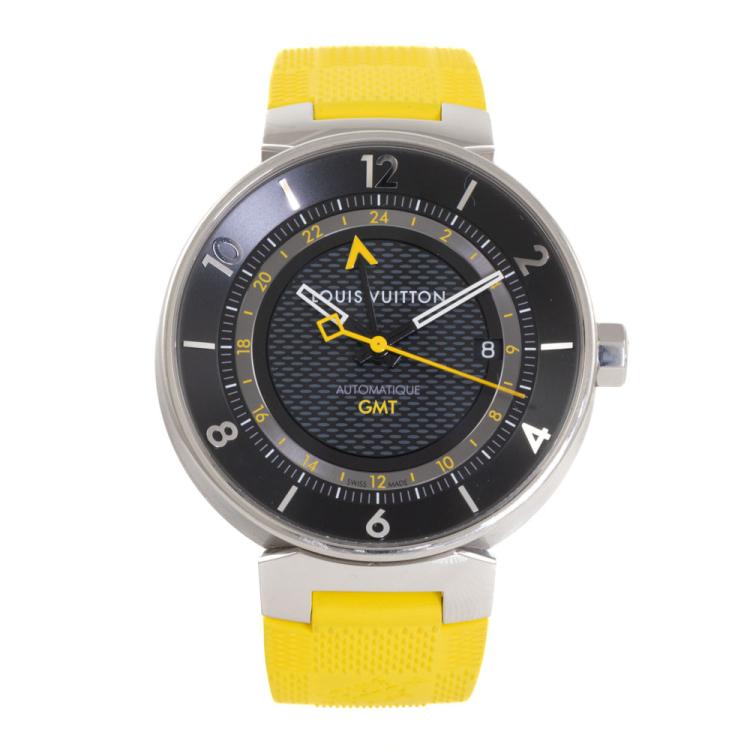Louis Vuitton Tambour Moon GMT stainless steel automatic mens watch. Black dial, date, case diameter: 41mm, strap length: 20.5cm, Swiss made. Ref# Q8D30. With Louis Vuitton yellow rubber strap and buckle. With Certificate of Authenticity. 3 month FSA warranty. (Pre-owned)