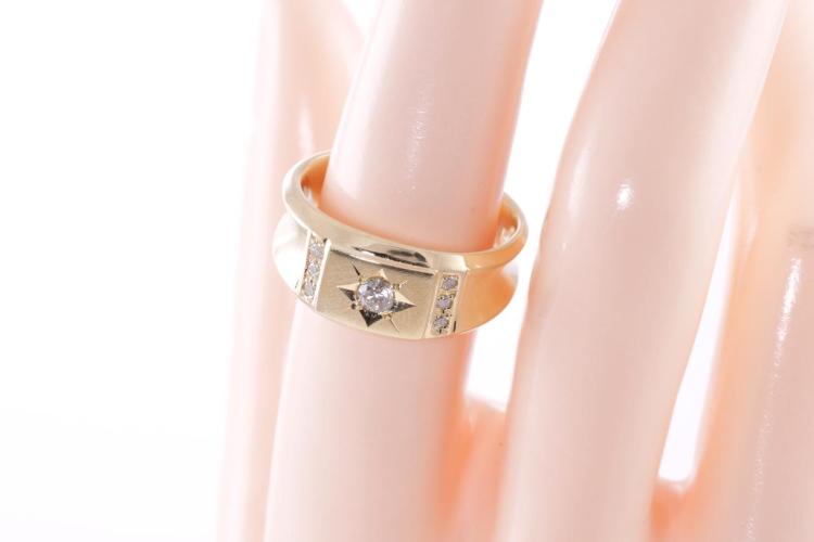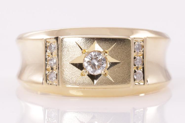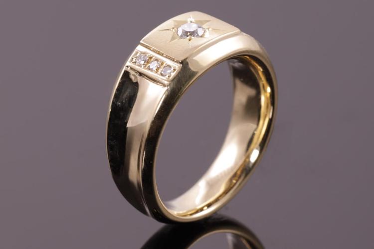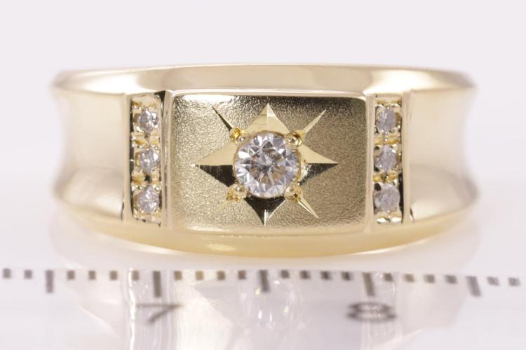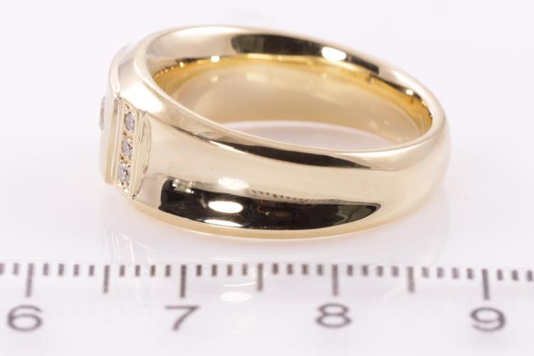 Mens Diamond Ring with round brilliant cut Diamonds totalling 0.20ct (Estimated grading: H P1). 18ct yellow gold. Ring size: P. Weight: 14.0g (Pre-owned)