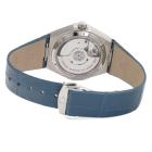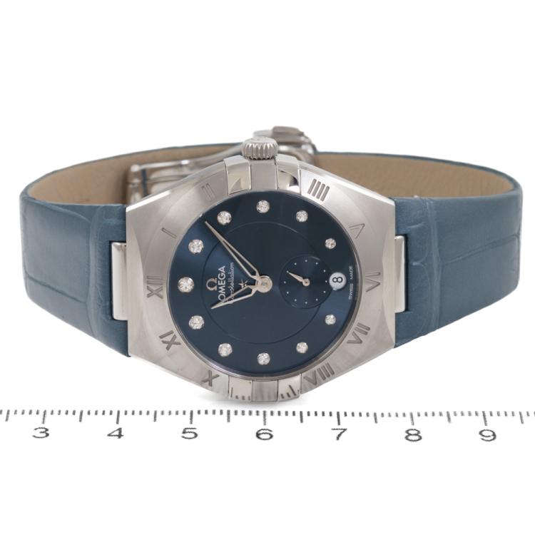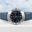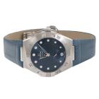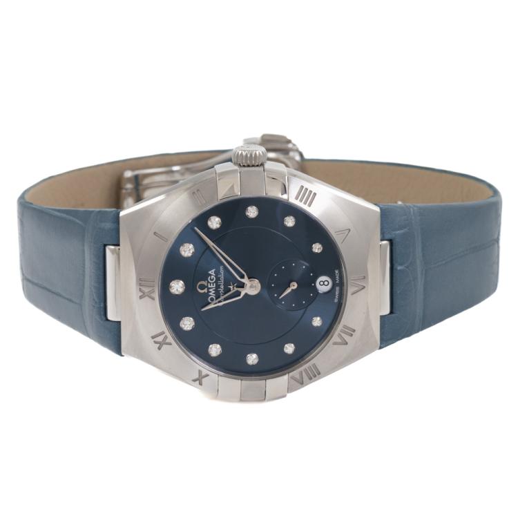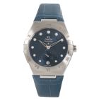 Omega Constellation stainless steel automatic ladies watch. Blue dial, Diamond indicators, small seconds, date, case diameter: 34mm, adjustable wrist size: 18.5cm, Swiss made. Ref# 131.13.34.20.53.001. With Omega blue leather strap and clasp. With Unstamped Omega International Warranty card, Precious Stones Certificate card, Pictograms card, and Omega box. 3 month FSA warranty (As new, Note: minor scuff on case and minor wear marks on strap due to being display stock)