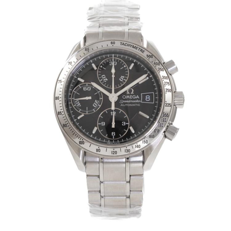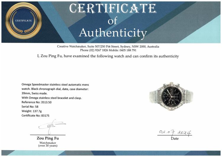 Omega Speedmaster stainless steel automatic mens watch. Black chronograph dial, date, case diameter: 39mm, wrist size: 19cm, Swiss made. Ref# 3513.50. With Omega stainless steel bracelet and clasp. With Certificate of Authenticity, Undated Omega International Warranty Card and Omega Pictograms Card. 3 month FSA warranty (Pre-owned)