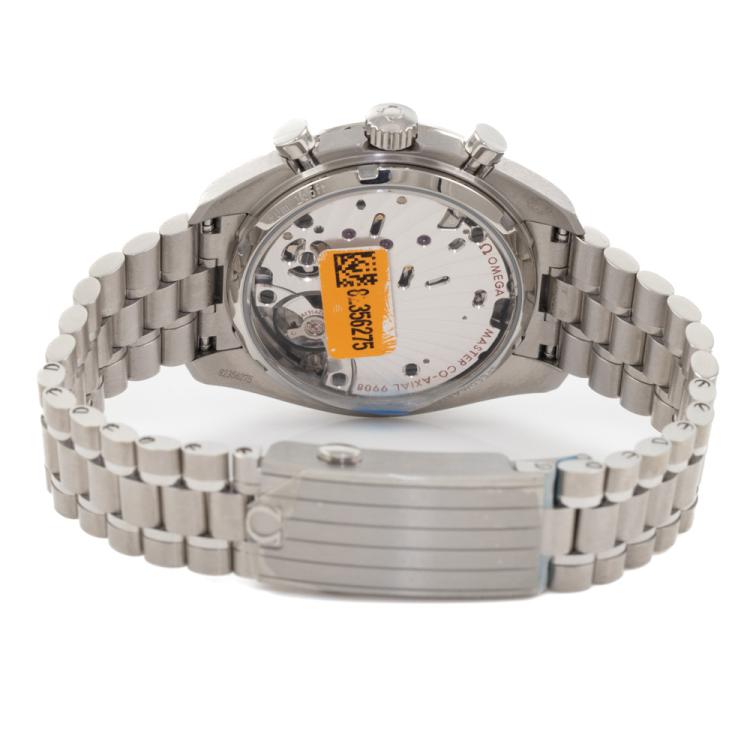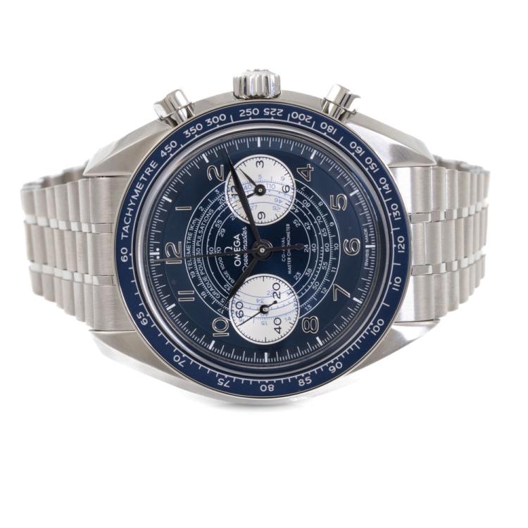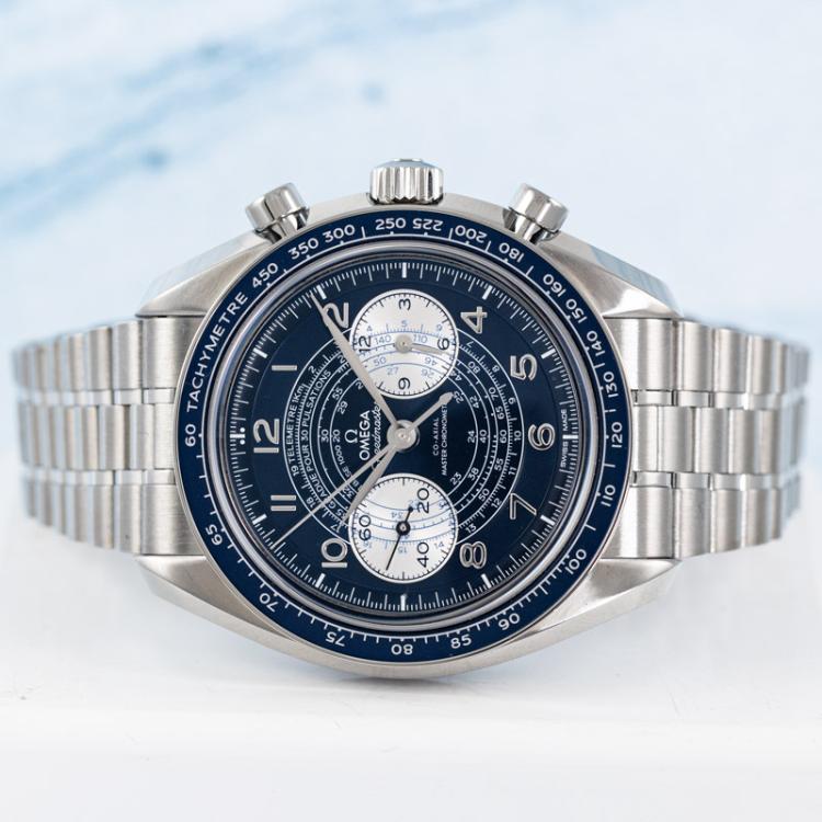 Omega Speedmaster Chronoscope stainless steel manual winding mens watch. Blue chronograph dial, case diameter: 43mm, wrist size: 20cm, Swiss made. Ref# 329.30.43.51.03.001. With Omega stainless steel bracelet and clasp. With Unstamped Omega International Warranty card, Omega Pictograms card and Omega Master chronometer card. 3 month FSA warranty (As new, Note: minor scuff on case and bracelet due to being display stock)
