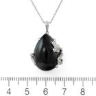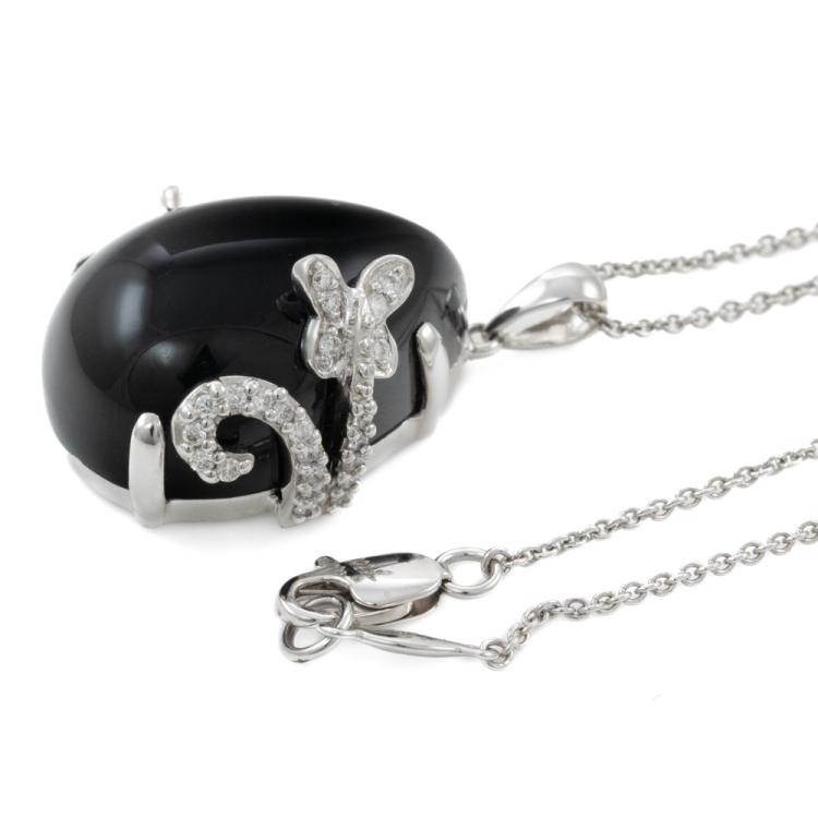 Onyx and Diamond pendant with a pear shape cabochon cut Onyx of size approximately 20mm x 14mm and round natural Diamonds totalling 0.18ct. 18ct white gold with 40cm 18ct white gold chain. Weight: 9.0g. (Pre-owned)