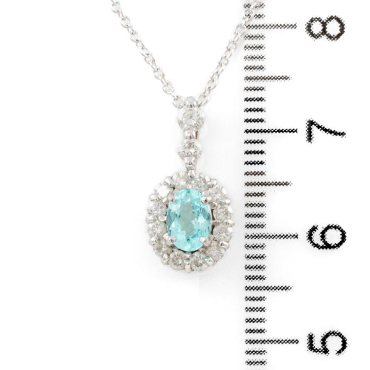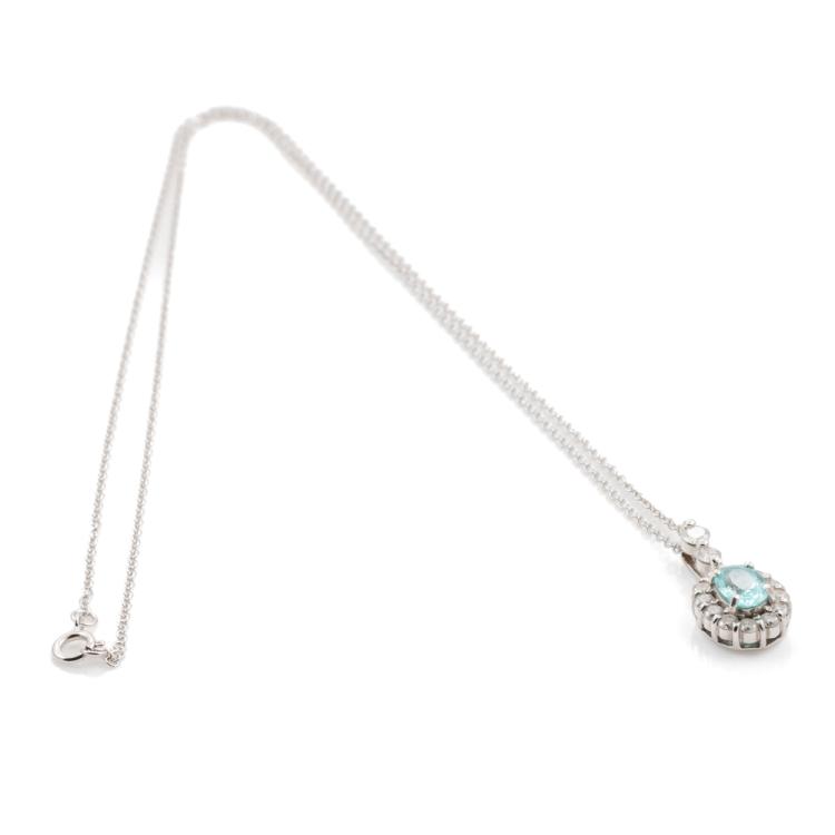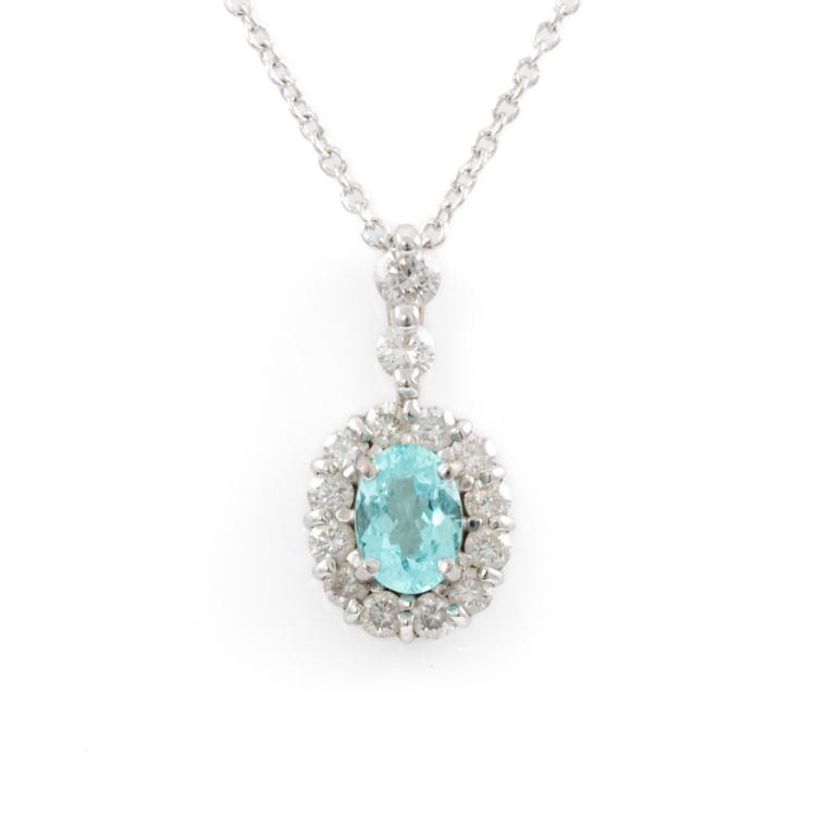 Tourmaline and Diamond pendant with oval shape Natural Paraiba Tourmaline of 0.45ct and natural Diamonds totalling 0.40cts (Estimated grading: G-H SI). 18ct white gold with 14ct white gold 40.0cm chain. Weight: 2.7g. (Pre-owned)