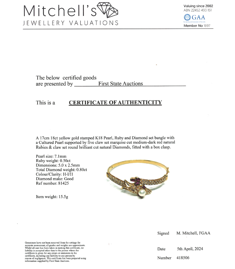 Pearl, Ruby & Diamond bangle with a Cultured Pearl of 7.1mm, marquise & pear cut Rubies totalling approximately 0.50ct and round natural Diamonds totalling approximately 0.80ct (Estimated grading: H-I P1). 18ct yellow gold. Circumference: 17cm. Weight: 15.5g. With Certificate 418506. (Pre-owned)