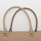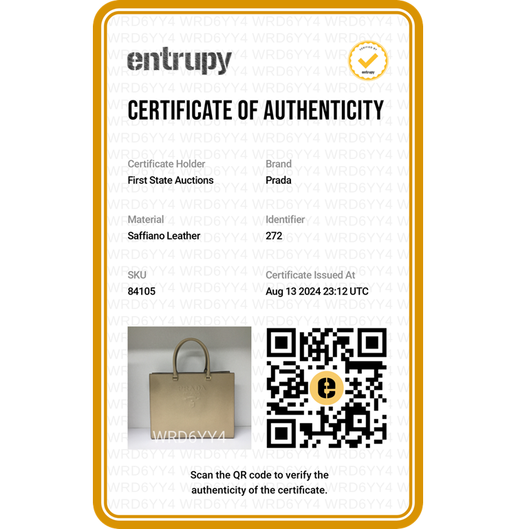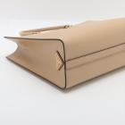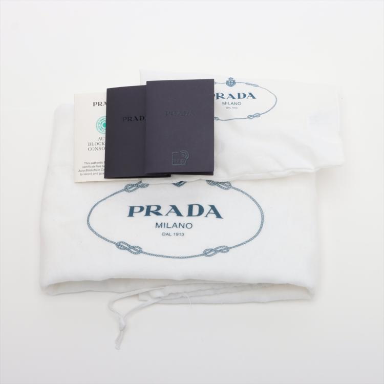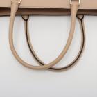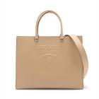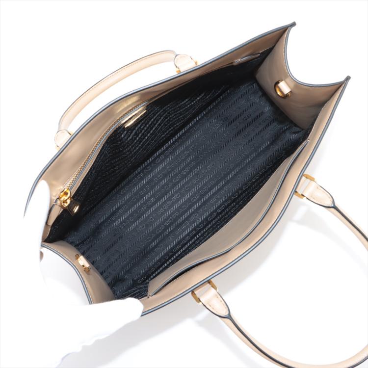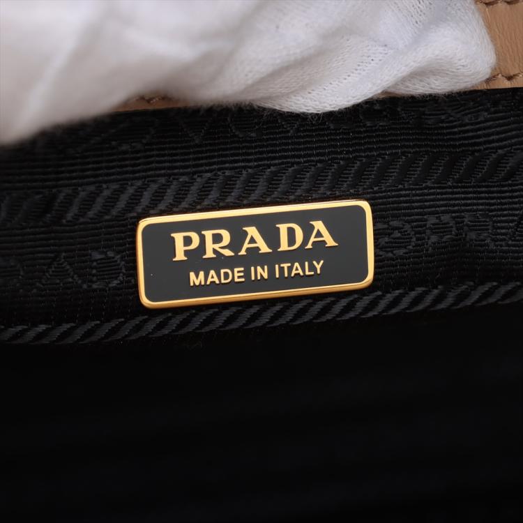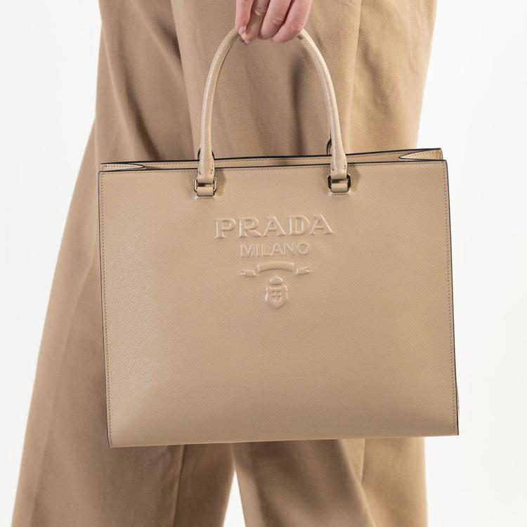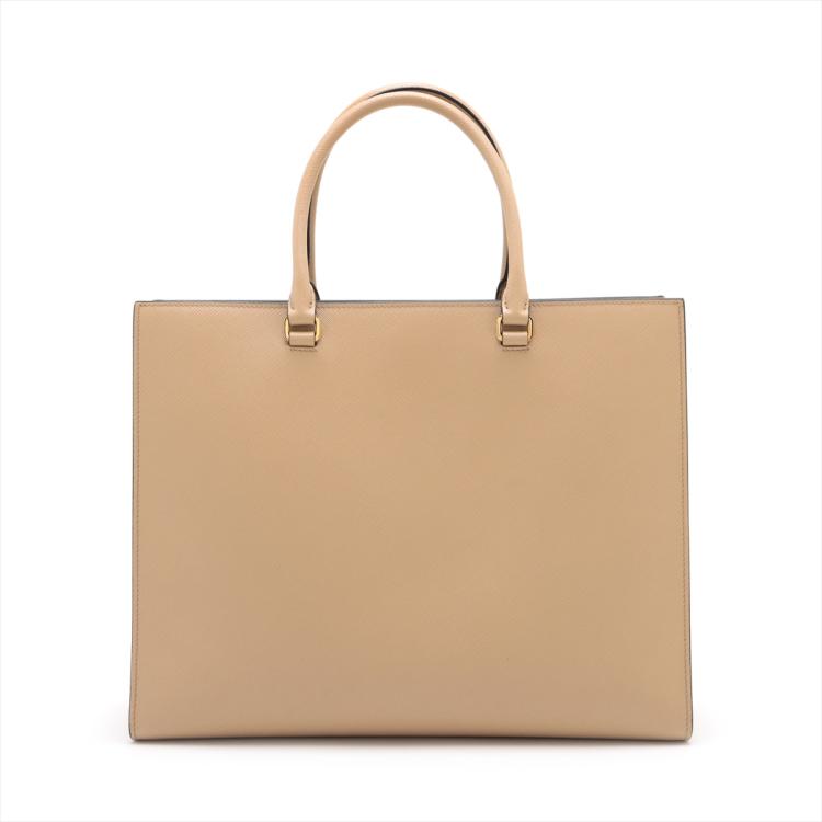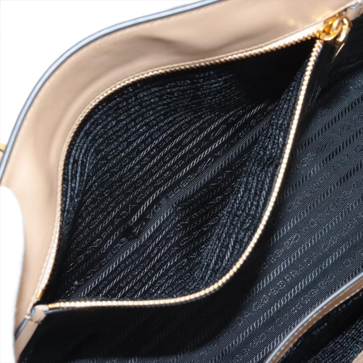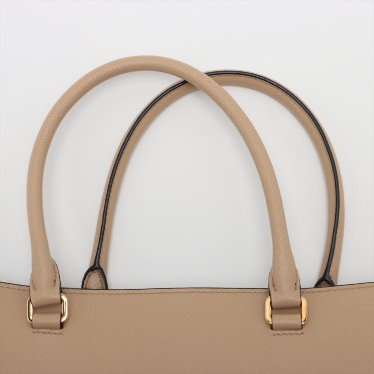 Prada large 2way bag in Beige Saffiano leather. Featuring gold-toned hardware, embossed logo at front and enamelled-metal triangle logo on the side, rolled leather top handles. The top opens to a black logo-printed fabric interior with a zipper and patch pockets. Approximate dimensions: 33.5cm(L) x 26.5cm(H) x 11cm(D), handle drop 12.5cm, strap drop 54.5cm, detachable and adjustable. Accompanied by Prada dustbags. With Entrupy Certificate of Authenticity. (Pre-owned)