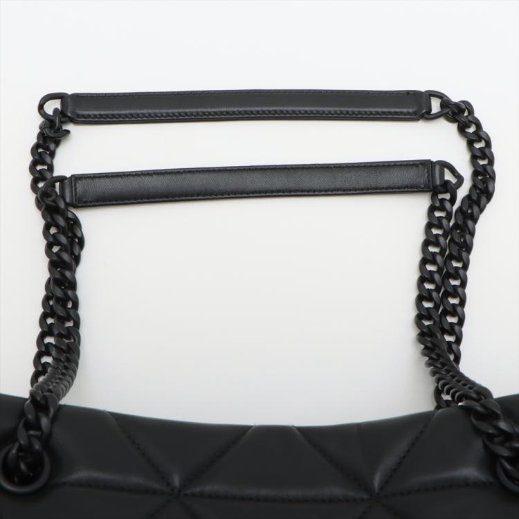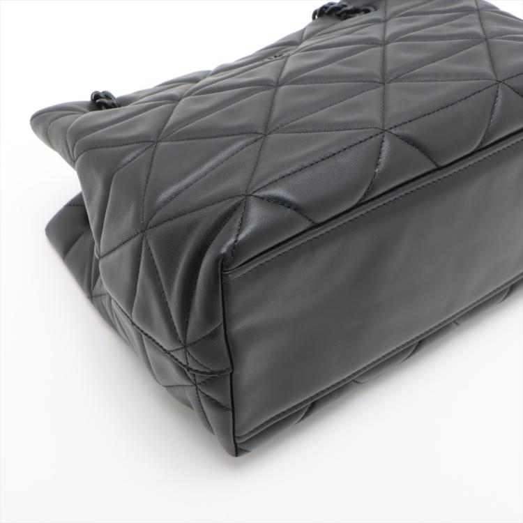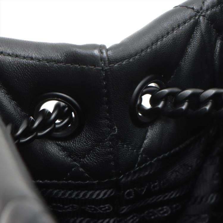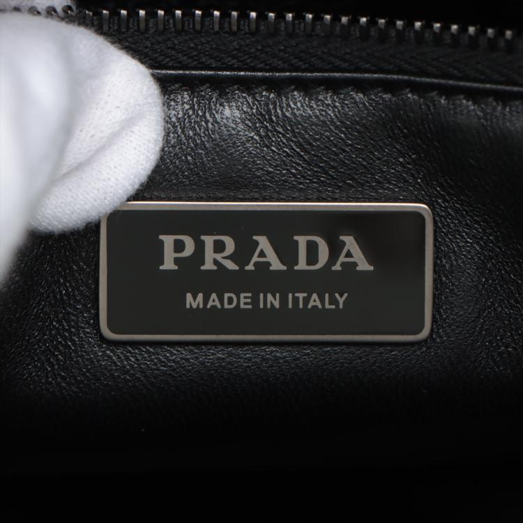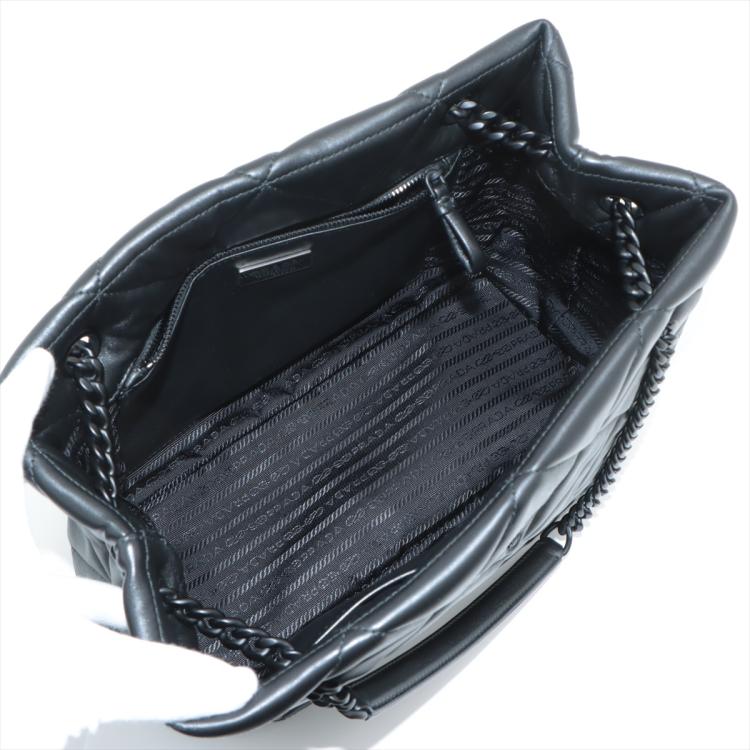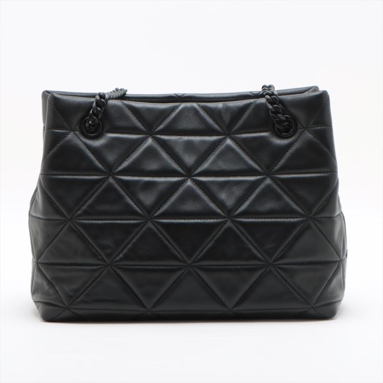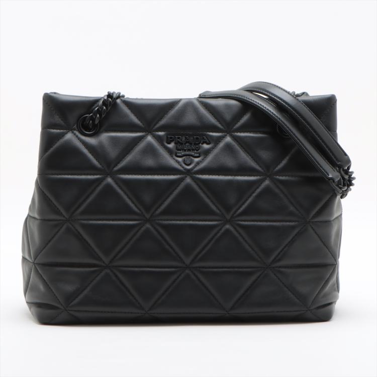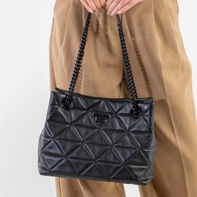 Prada spectrum tote bag in black triangle-stitch Nappa leather. Featuring black-toned hardware, sliding chain shoulder straps, and hardware logo at front. The top opens to a black logo-printed nylon interior with zipper and patch pockets. Approximate dimensions: 29cm(L) x 23cm(H) x 13.5cm(D), strap drop 25cm. Accompanied by Prada authentication card (dated 21/04/2023). With Entrupy Certificate of Authenticity. (Pre-owned)