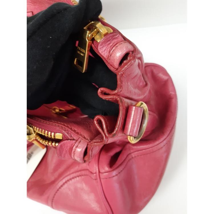 Prada 2way bag in pink Vitello shine soft leather. Featuring top rolled handles, gold toned hardware, metal logo at front, dual zipped exterior pockets. The snap button closure opens to a logo jacquard pink nylon lining interior with zipped and patch pockets. Approximate dimensions: 36cm(W) x 22cm(H) x 13cm(D), 12cm handle drop and 55cm adjustable strap drop height. Accompanied by a luggage name tag. With Entrupy Certificate of Authenticity. (Pre-owned)