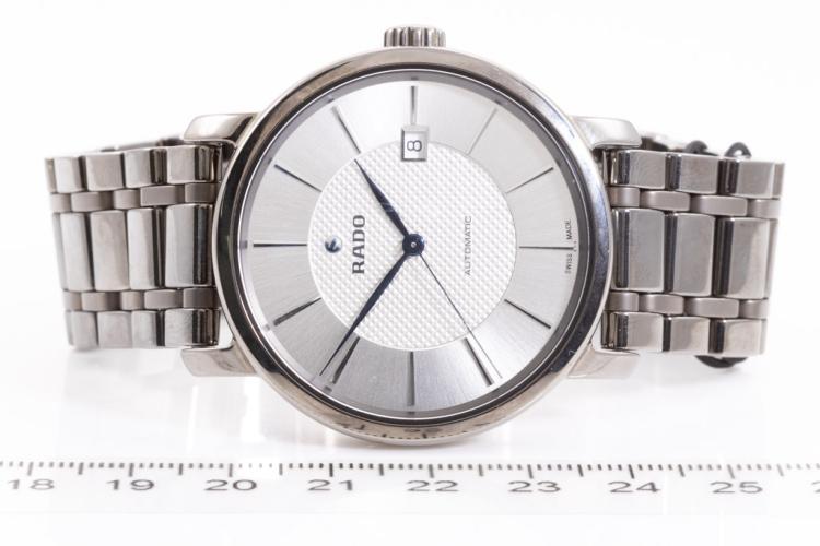 Rado Diamaster XL ceramic automatic mens watch. Silver dial, date, case diameter: 41mm, wrist size: 18cm, Swiss made. Ref# R14074132. With Rado ceramic bracelet and clasp. With Rado 2-Year International Warranty Card and Rado case. Rado warranty applies. (As New, note: minor scratches on case and light wear on bracelet due to being display stock)