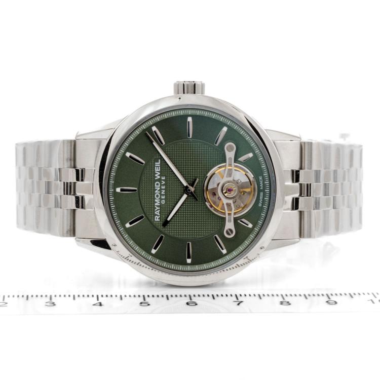 Raymond Weil Freelancer stainless steel automatic mens watch. Green dial, case diameter: 42mm, wrist size: 21cm, Swiss made. Ref# 2780-ST-52001. With Raymond Weil stainless steel bracelet and clasp. With Raymond Weil Guarantee Certificate card and Raymond Weil box. 12 month FSA warranty (As new, Note: case and bracelet on original wrapping)