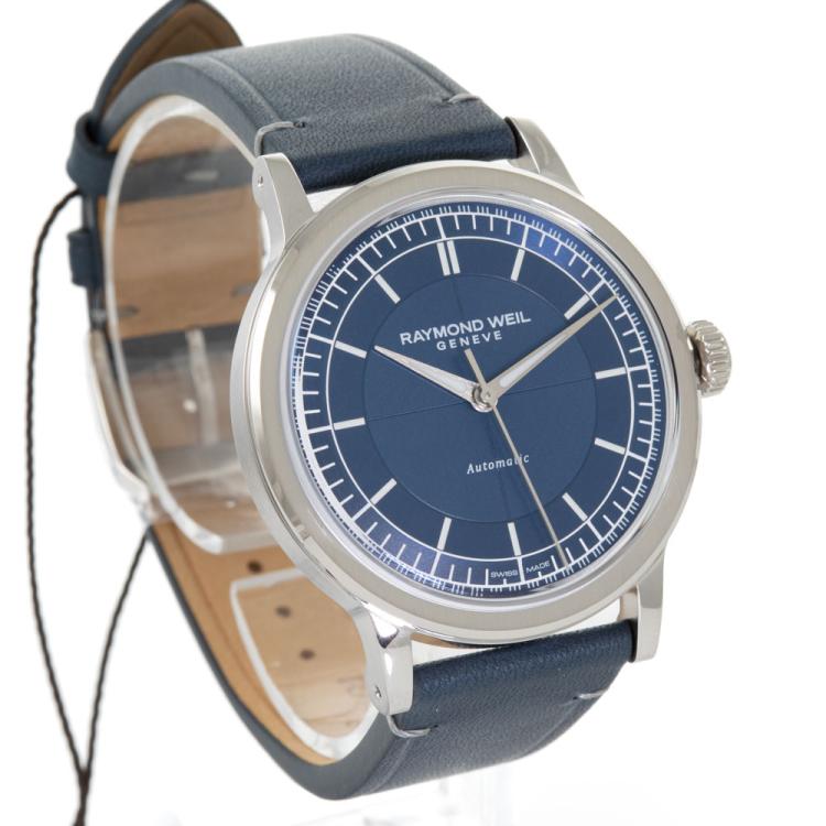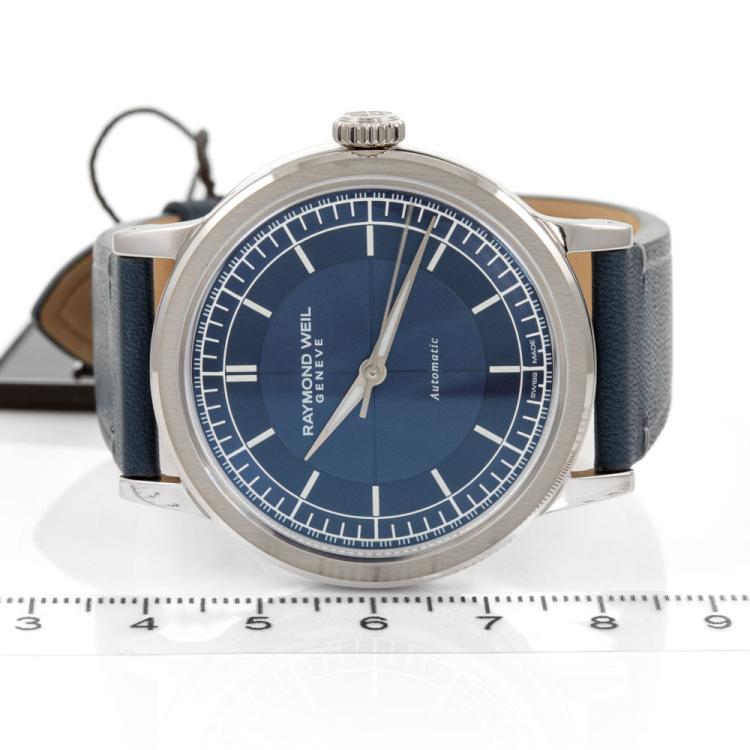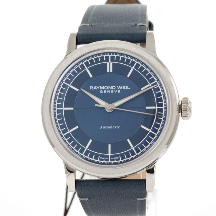 Raymond Weil Millesime stainless steel automatic mens watch. Blue dial, case diameter: 39.5mm, wrist size: 21cm, Swiss made. Ref# 2925-STC-50001. With Raymond Weil blue leather strap and buckle. With Raymond Weil Guarantee card and Raymond Weil box. 12 month FSA warranty (As new, Note: case on original wrap and minor wear marks on strap due to being display stock)