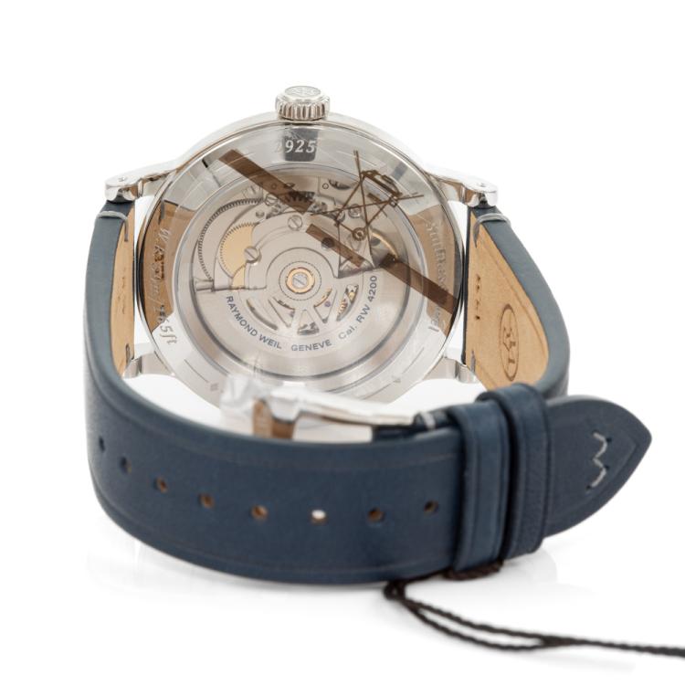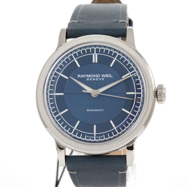 Raymond Weil Millesime stainless steel automatic mens watch. Blue dial, case diameter: 39.5mm, wrist size: 21cm, Swiss made. Ref# 2925-STC-50001. With Raymond Weil blue leather strap and buckle. With Undated Raymond Weil Guarantee card and Raymond Weil box. 12 month FSA warranty (As new, Note: case on original wrap and minor wear marks on strap due to being display stock)