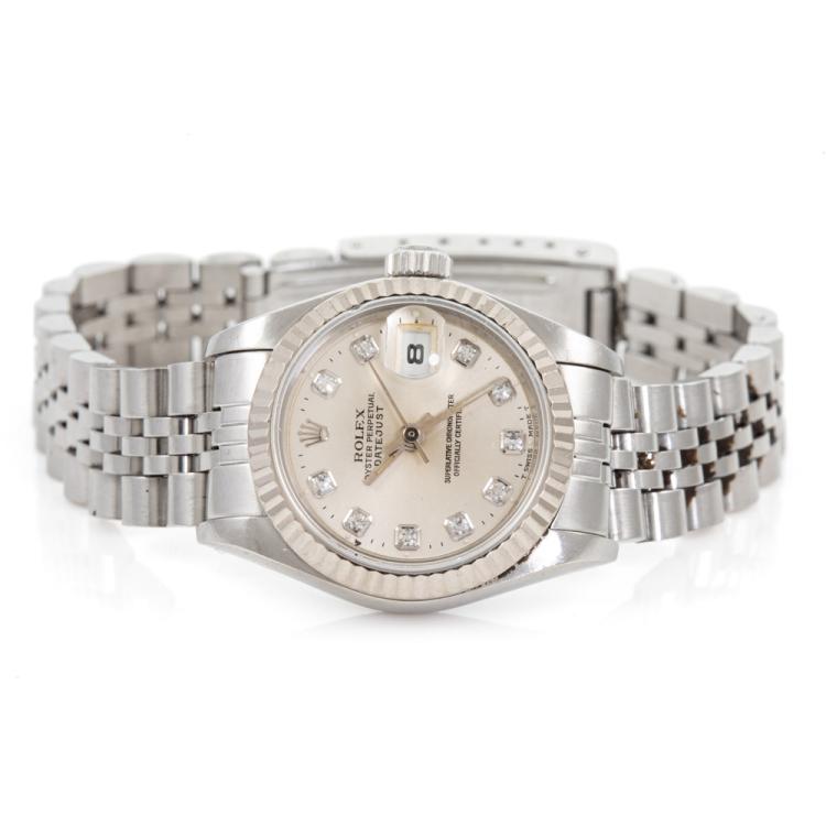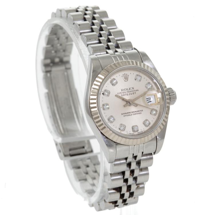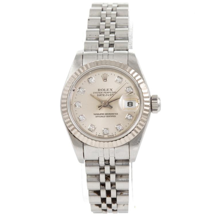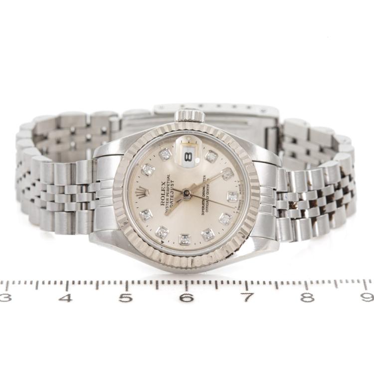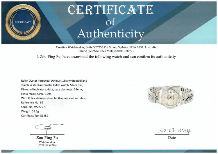 Rolex Oyster Perpetual Datejust 18ct white gold and stainless steel automatic ladies watch. Silver dial, Diamond indicators, date, case diameter: 26mm, wrist size: 17.5cm, Swiss made. Ref# 69174G. Circa: 1995. With Rolex stainless steel Jubilee bracelet and clasp. With Certificate of Authenticity, Rolex Guarantee Certificate dated 21/01/1996 and Rolex box. 3 month FSA warranty (Pre-owned)