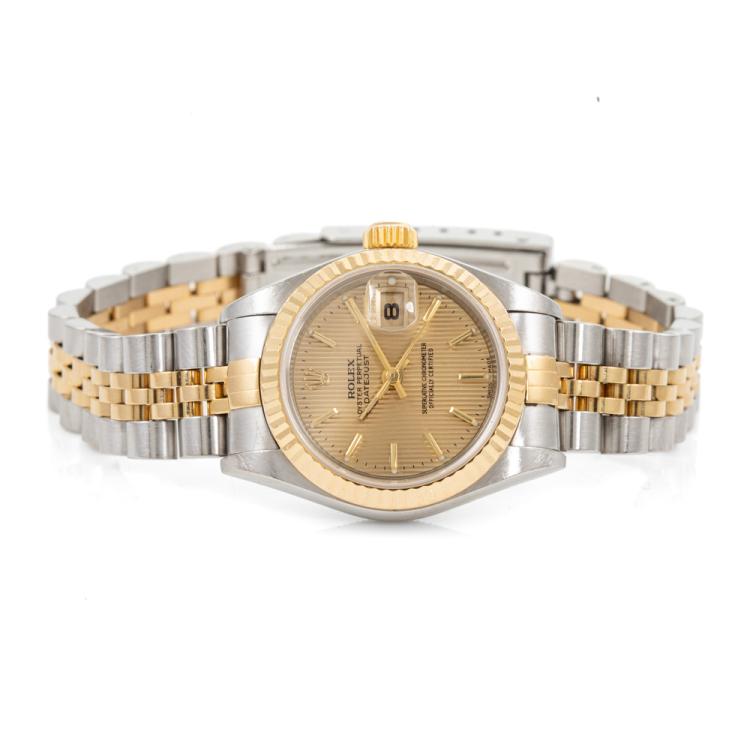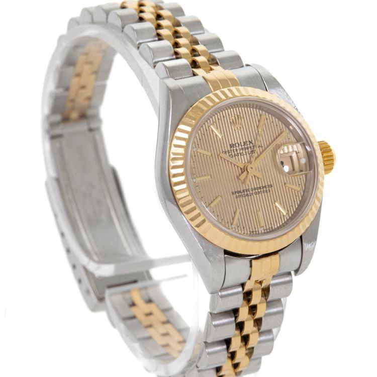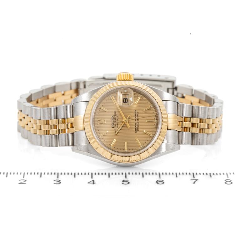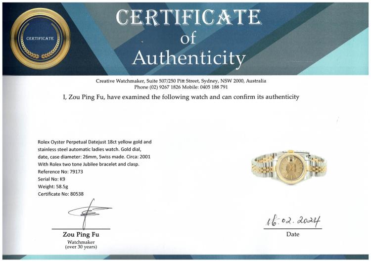 Rolex Oyster Perpetual Datejust 18ct yellow gold and stainless steel automatic ladies watch. Gold dial, date, case diameter: 26mm, wrist size:17cm, Swiss made. Ref# 79173. Circa: 2001. With Rolex two tone Jubilee bracelet and clasp. With Certificate of Authenticity, Creative watchmaker invoice dated 19/04/24 and Rolex box. 6 month of Watchmaker warranty from the date of full service. (Pre-owned)