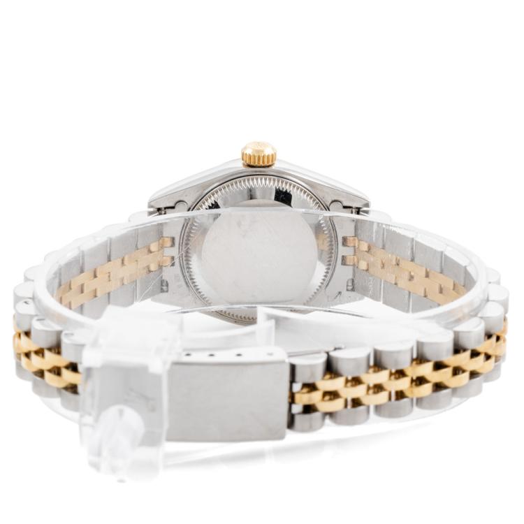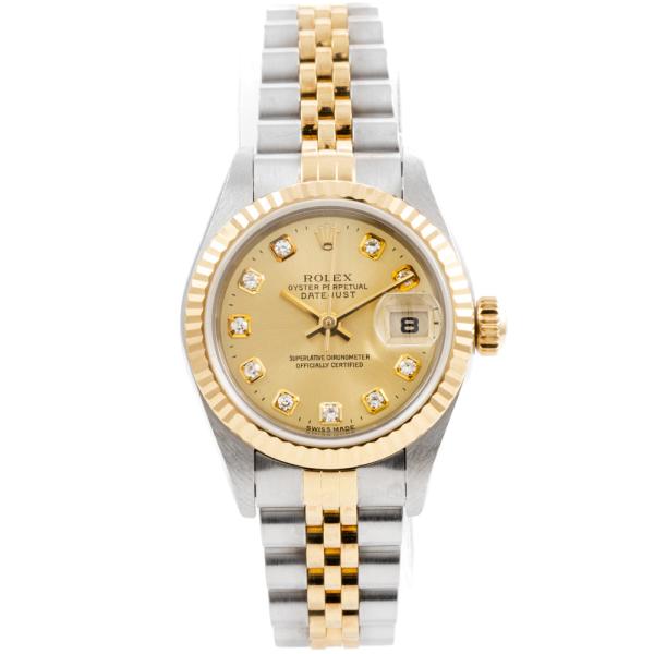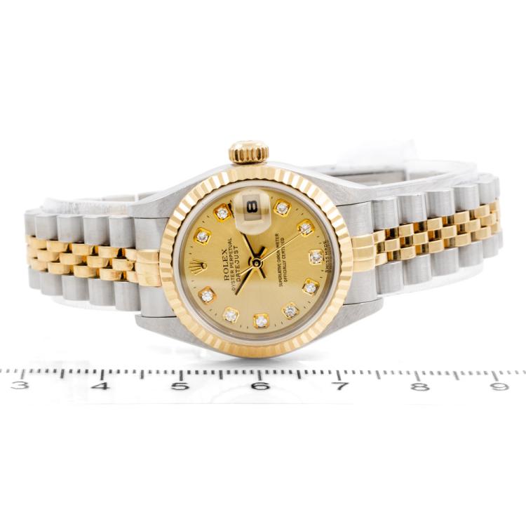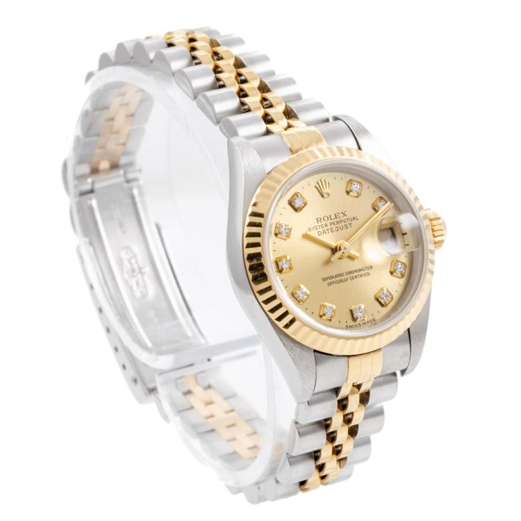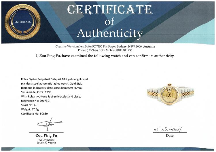 Rolex Oyster Perpetual Datejust 18ct yellow gold and stainless steel automatic ladies watch. Gold dial, Diamond indicators, date, case diameter: 26mm, wrist size: 16.5cm, Swiss made. Ref# 79173G. Circa: 1999. With Rolex two-tone Jubilee bracelet and clasp. With Certificate of Authenticity and Rolex box with Rolex gift bag. 3 month FSA warranty (Pre-owned)