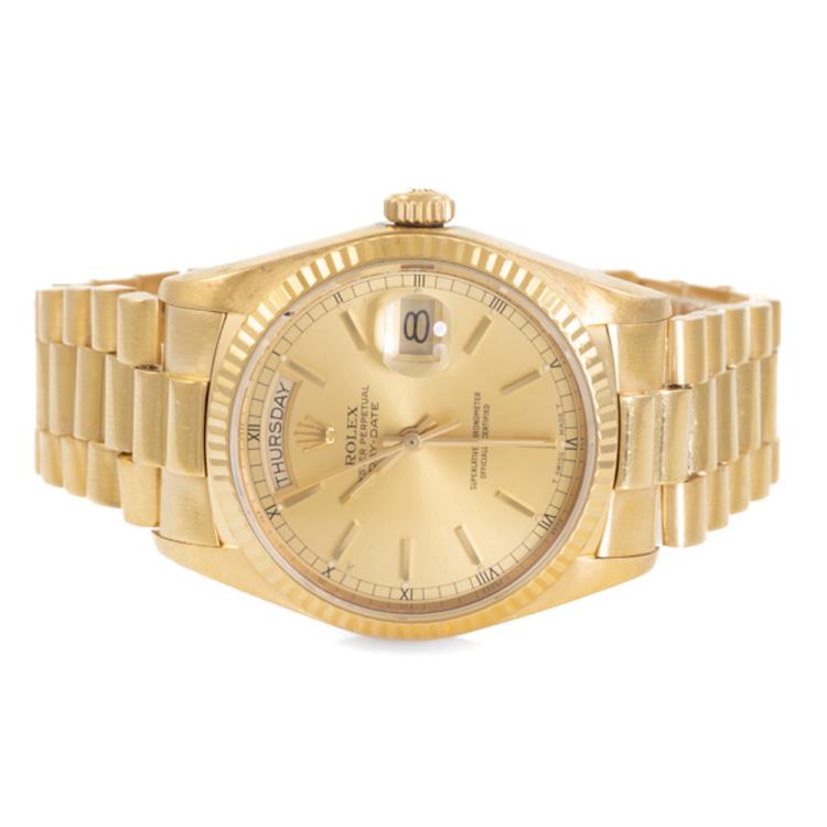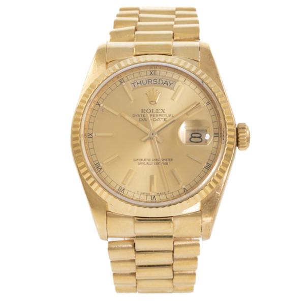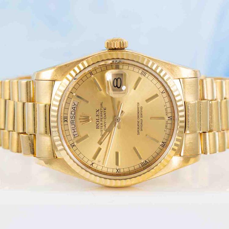 Rolex Oyster Perpetual Day-Date 18ct yellow gold automatic mens watch. Gold dial, day & date, case diameter: 36mm, wrist size: 18cm, Swiss made. Ref# 18038. Circa: 1984. With Rolex 18ct yellow gold Presidential bracelet and clasp. With Certificate of Authenticity and Rolex box. 3 month FSA warranty (Pre-owned)