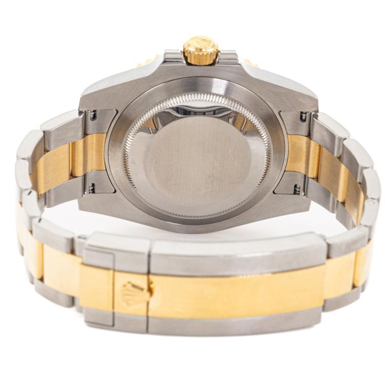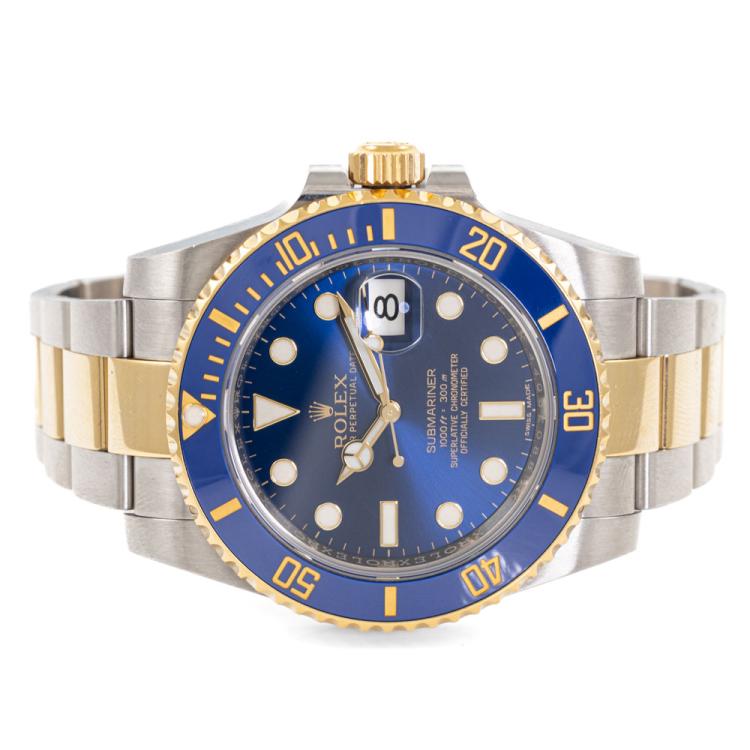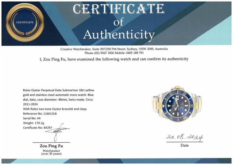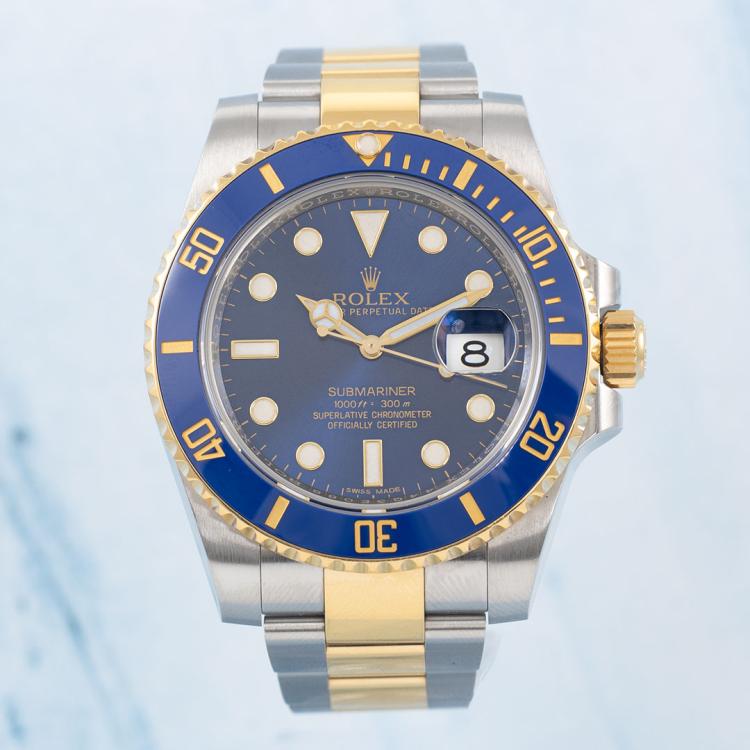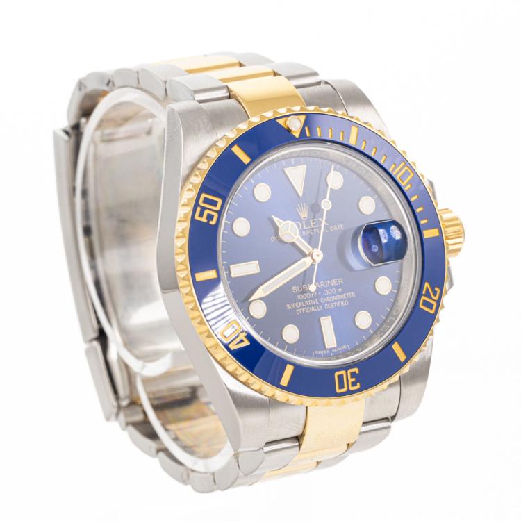 Rolex Oyster Perpetual Date Submariner 18ct yellow gold and stainless steel automatic mens watch. Blue dial, date, case diameter: 40mm, wrist size: 18cm, Swiss made. Ref# 116613LB. Circa: 2011-2024. With Rolex two-tone Oyster bracelet and clasp. With Certificate of Authenticity and Rolex box. 3 month FSA warranty (Pre-owned)