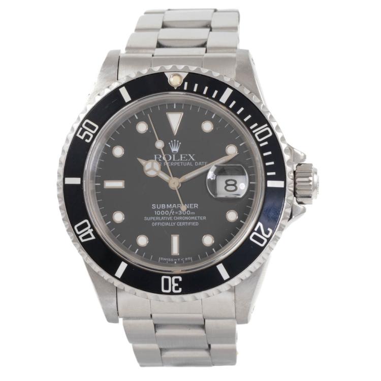 Rolex Oyster Perpetual Submariner Date stainless steel automatic mens watch. Black dial, date, case diameter: 40mm, wrist size: 18cm, Swiss made. Ref# 16610. Circa: 1991. With Rolex stainless steel Oyster bracelet and clasp. With Certificate of Authenticity and Rolex box. 3 month FSA warranty (Pre-owned)