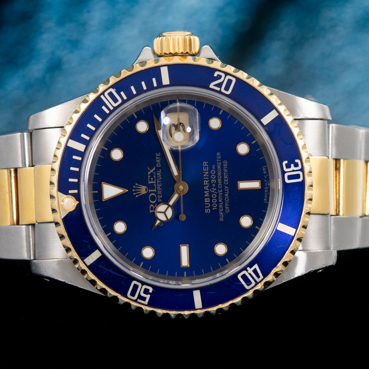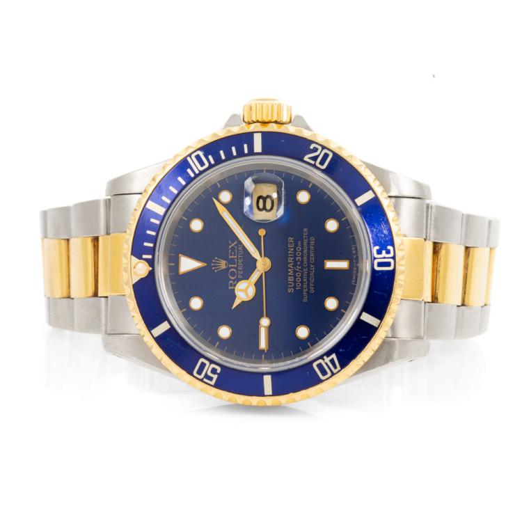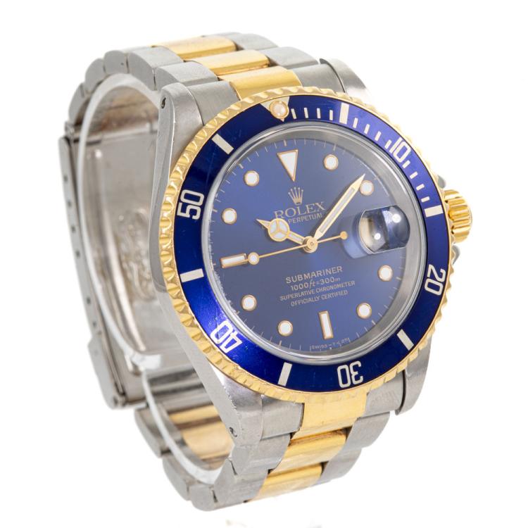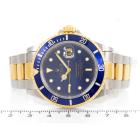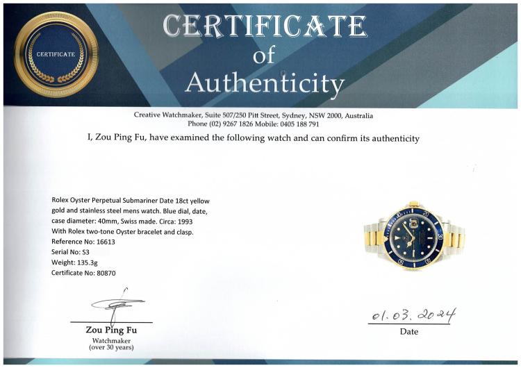 Rolex Oyster Perpetual Submariner Date 18ct yellow gold and stainless steel mens watch. Blue dial, date, case diameter: 40mm, wrist size: 17.5cm, Swiss made. Ref# 16613. Circa: 1993. With Rolex two-tone Oyster bracelet and clasp. With Certificate of Authenticity and Rolex box. 3 month FSA warranty (Pre-owned)
