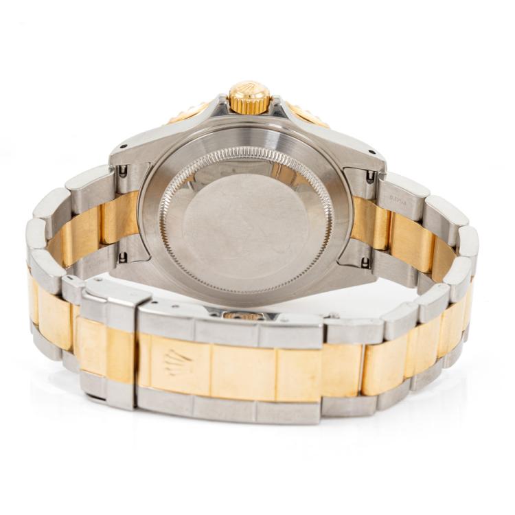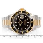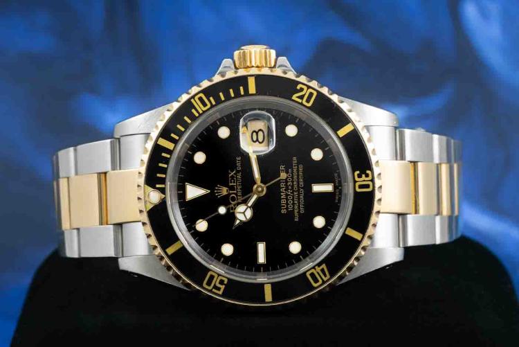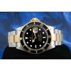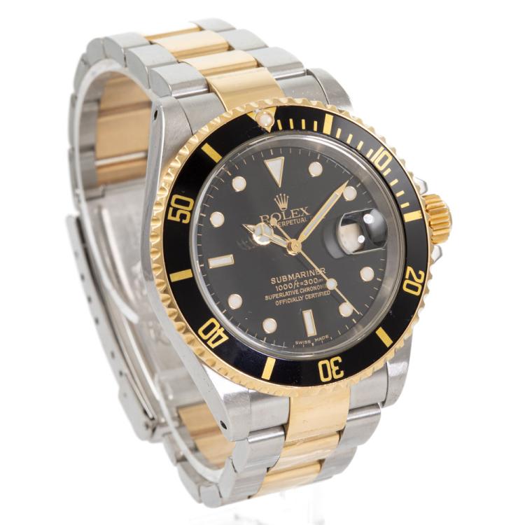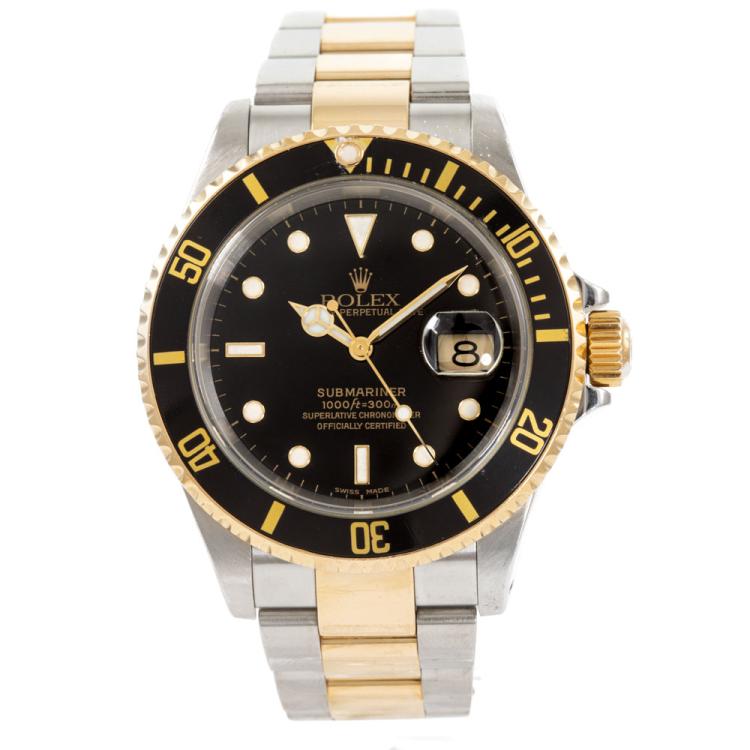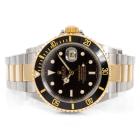 Rolex Oyster Perpetual Submariner Date 18ct yellow gold and stainless steel automatic mens watch. Black dial, date, case diameter: 40mm, wrist size: 18cm, Swiss made. Ref# 16613. Circa: 2000. With Rolex two-tone bracelet and clasp. With Certificate of Authenticity, Rolex Guarantee Certificate dated 22/04/2002 and Rolex box. 3 month FSA warranty (Pre-owned)