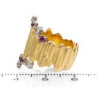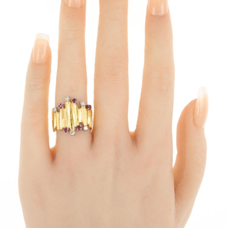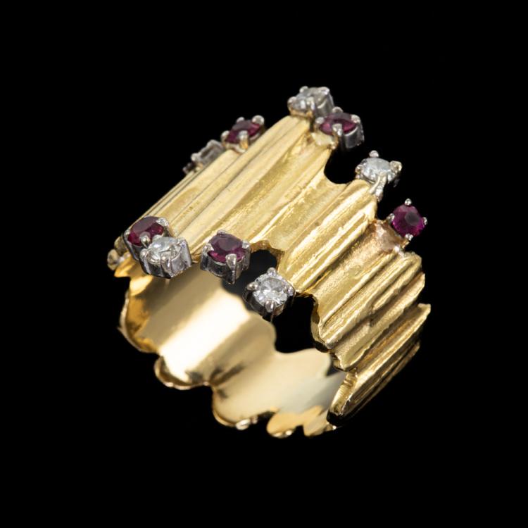 Ruby and Diamond fancy ring with round natural Rubies totalling approx. 0.25cts and round natural Diamonds totalling 0.20cts. 18ct yellow and white gold. Ring size L - ring resizing is not recommended. Band width: 7.4mm - 10.5mm. Weight: 8.8g. (Pre-owned)