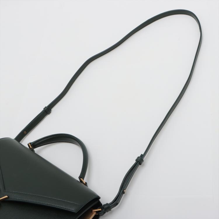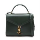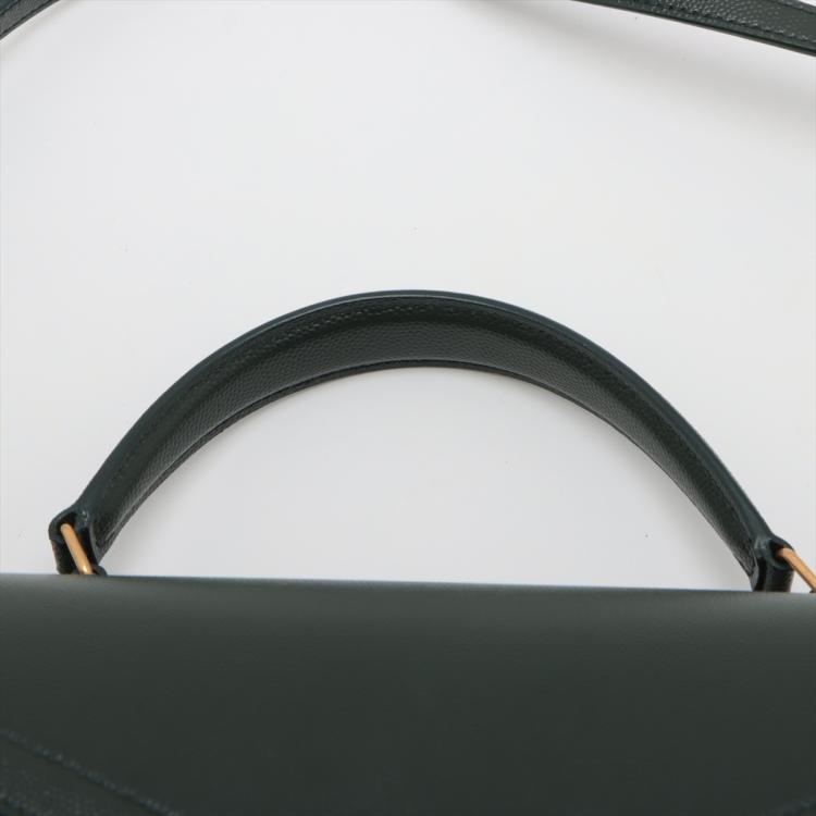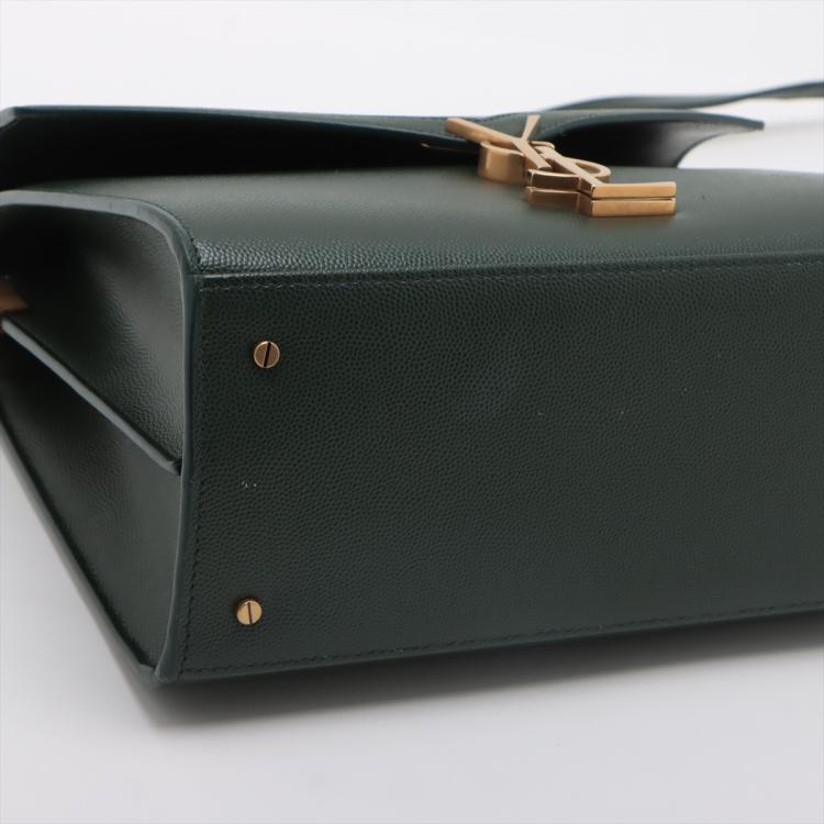 Saint Laurent Cassandra medium top handle bag in green grainy leather. Featuring an exterior pocket at back, single leather top handle, gold-toned hardware, frontal flap with pivoting YSL closure. This opens to a burgundy leather interior with 2 compartments and a patch pocket. Approximate dimensions: 24.5cm(L) x 19cm(H) x 11.5cm(D), 8cm handle drop and 51cm detachable strap drop. With Entrupy Certificate of Authenticity. (Pre-owned)