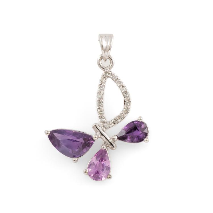 Butterfly design pendant with pear & fancy shape pink & purple unheated Ceylon Natural Sapphire totalling 1.95ct (Note: one Sapphire tested only) and round Natural Diamonds totalling 0.19cts. 14ct white gold. No chain provided. Weight: 1.6g. With GGTL Report #206197. (As new)